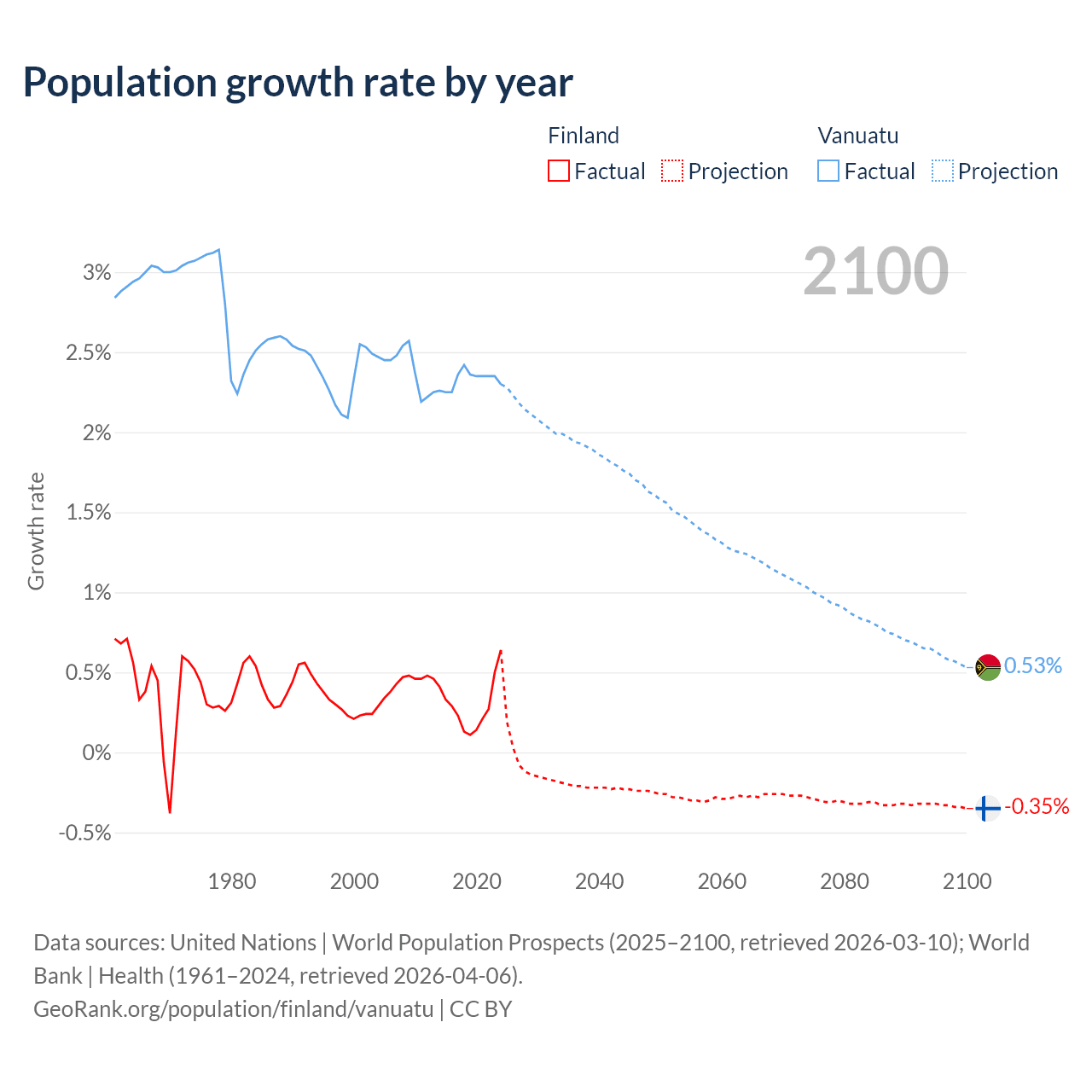 - For the last 10 years, Finland has had an average growth rate of +0.3% per year vs +2.33% in Vanuatu.
