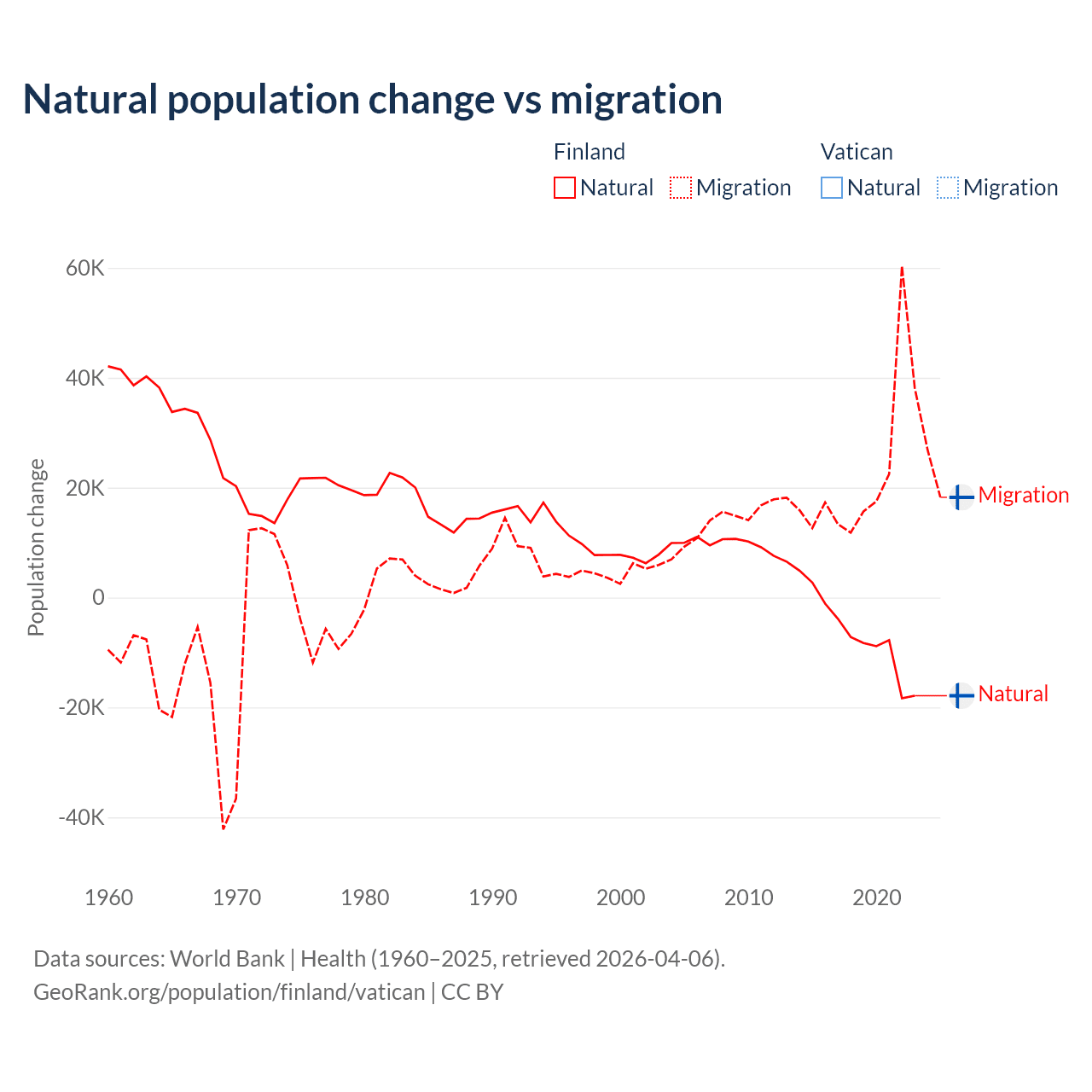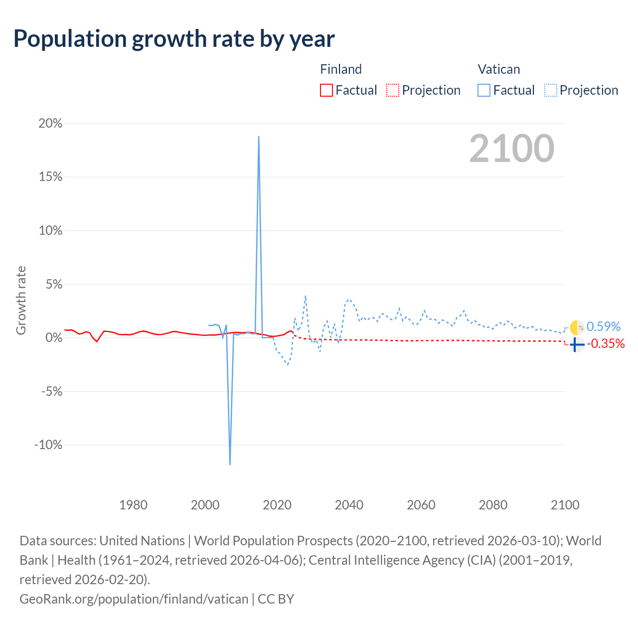 - For the last 10 years, Finland has had an average growth rate of +0.3% per year vs +1.9% in the Vatican.