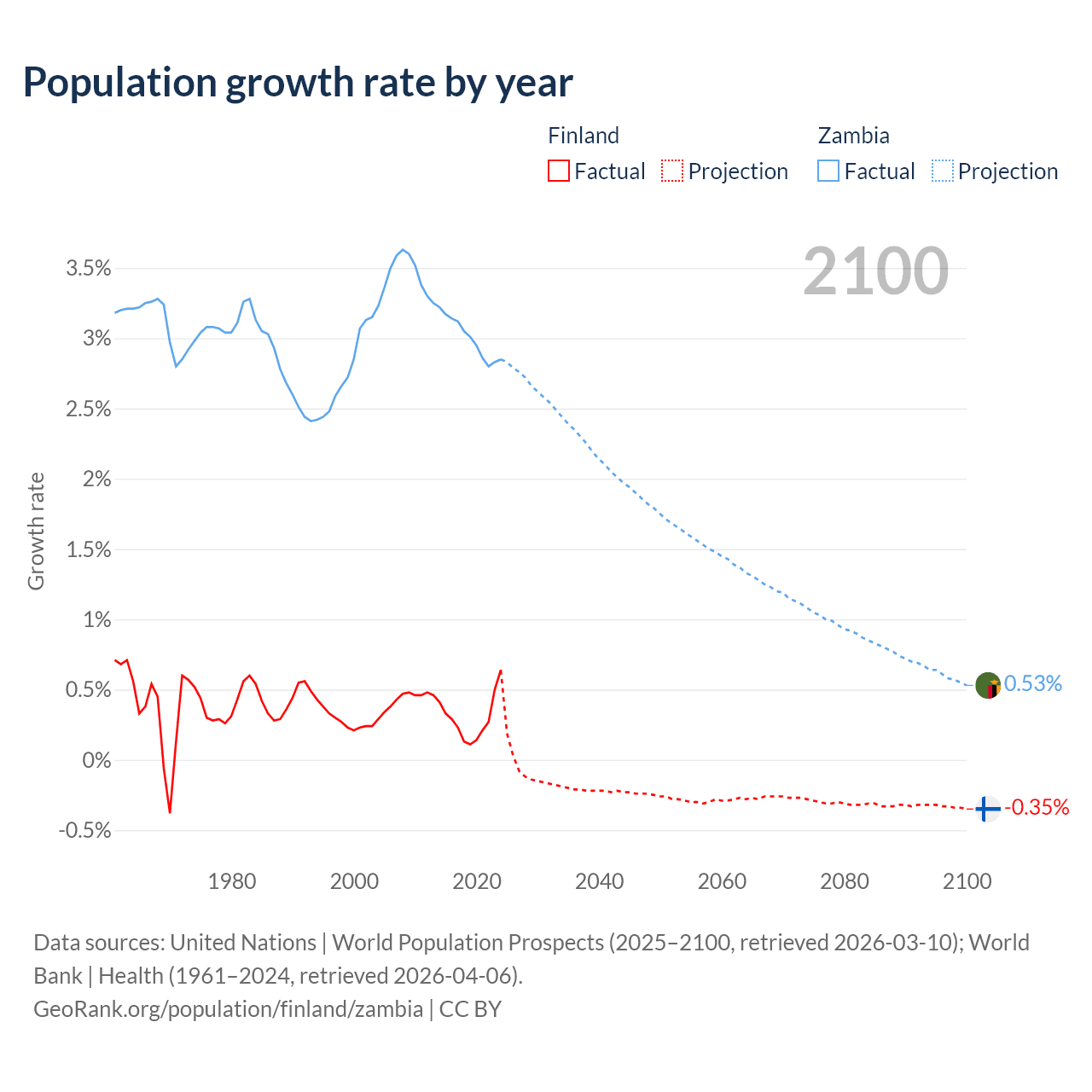 - For the last 10 years, Finland has had an average growth rate of +0.3% per year vs +3% in Zambia.