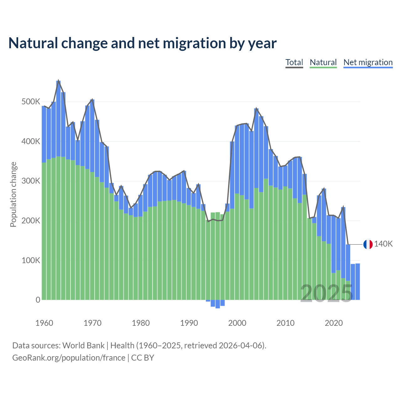 Over the last 10 years, 59.5% of the population change in France is from natural causes (a gain of 1,359,540 people) and 40.5% is from migration (a gain of 923,723 people).