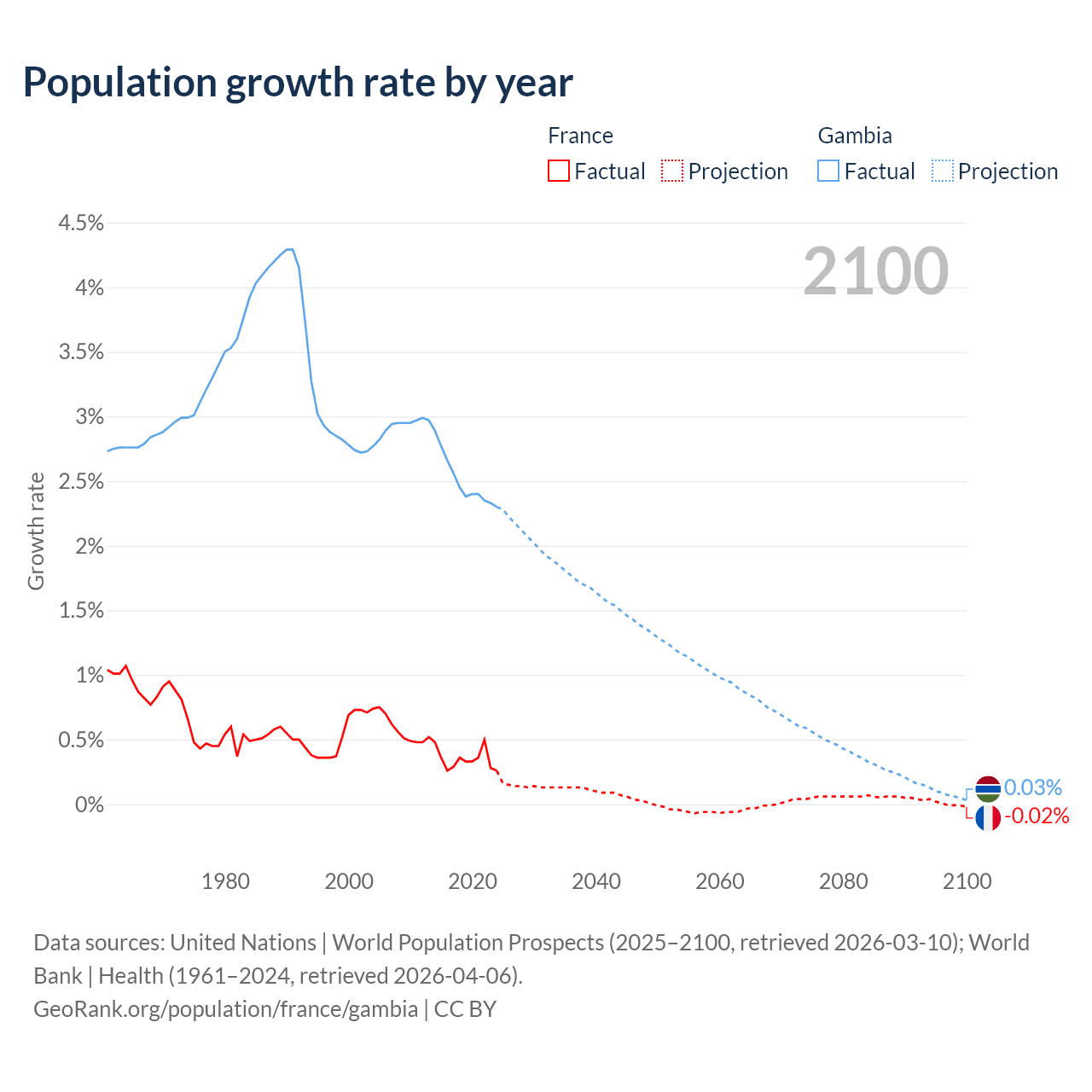 - For the last 10 years, France has had an average growth rate of +0.35% per year vs +2.5% in the Gambia.