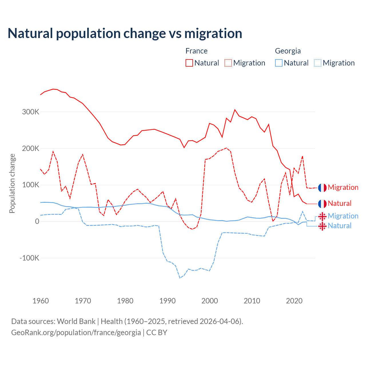 Over the last 10 years, 59.5% of the population change in France is from natural causes (a gain of 1,359,540 people) and 40.5% is from migration (a gain of 923,723 people). In Georgia 57.7% is from natural causes (a gain of 47,646 people) and 42.3% is from migration (a loss of 34,907 people).
