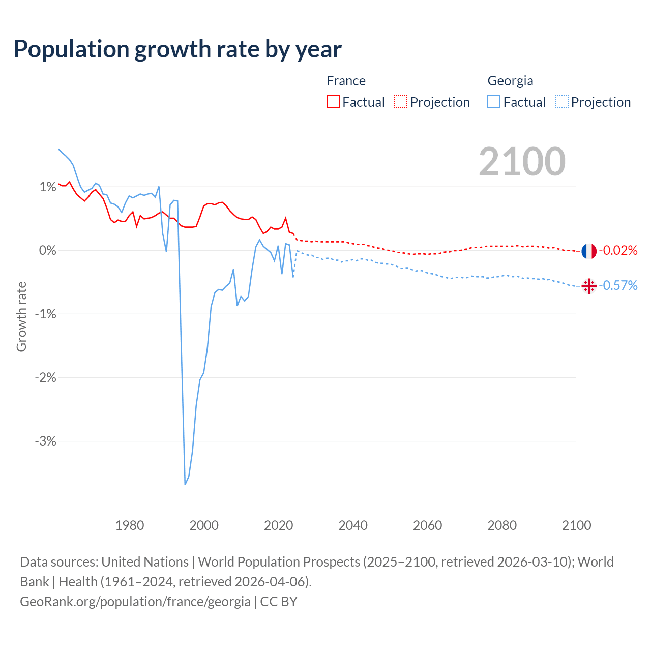 - For the last 10 years, France has had an average growth rate of +0.35% per year vs -0.04% in Georgia.