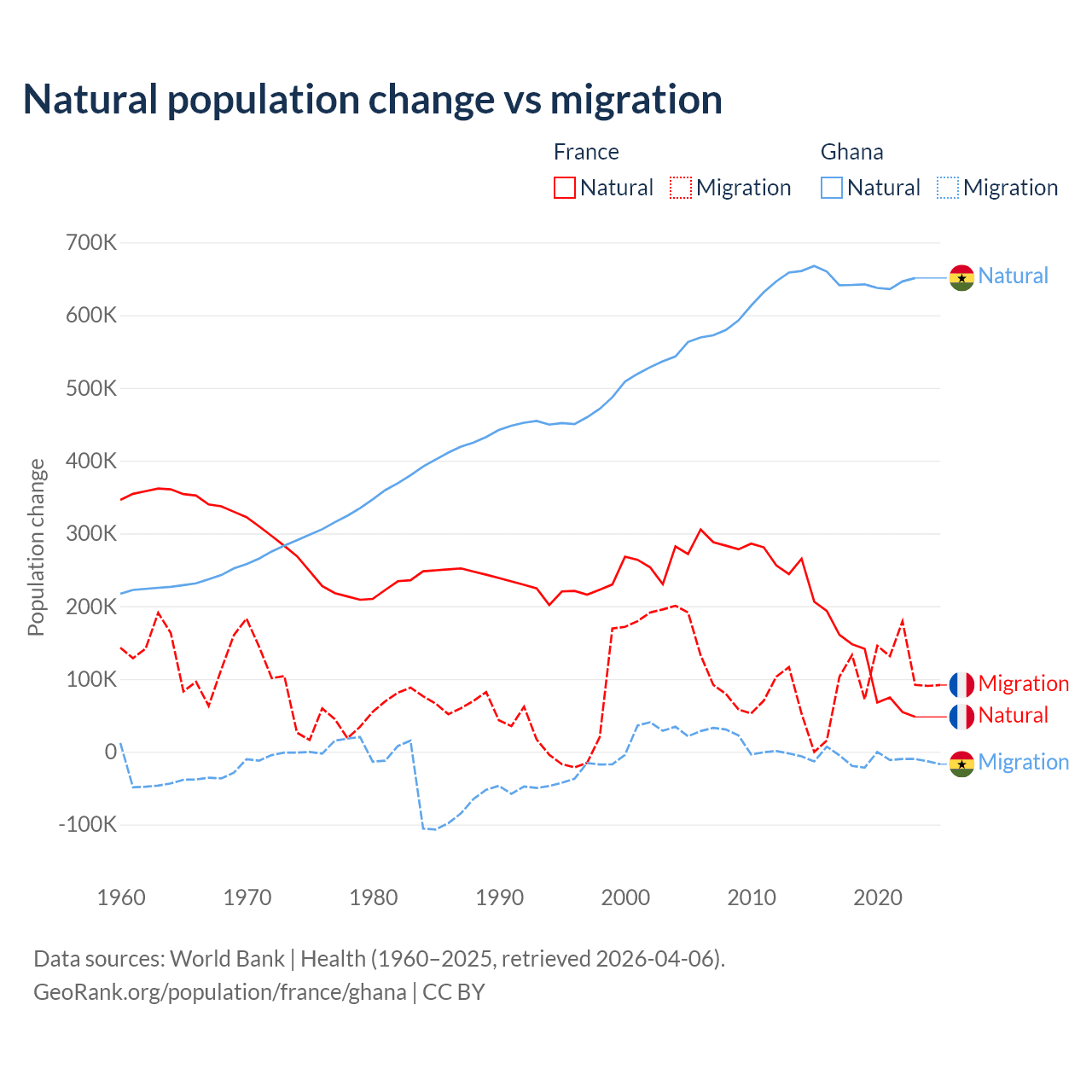 Over the last 10 years, 59.5% of the population change in France is from natural causes (a gain of 1,359,540 people) and 40.5% is from migration (a gain of 923,723 people). In Ghana 98.6% is from natural causes (a gain of 6,484,449 people) and 1.37% is from migration (a loss of 90,310 people).