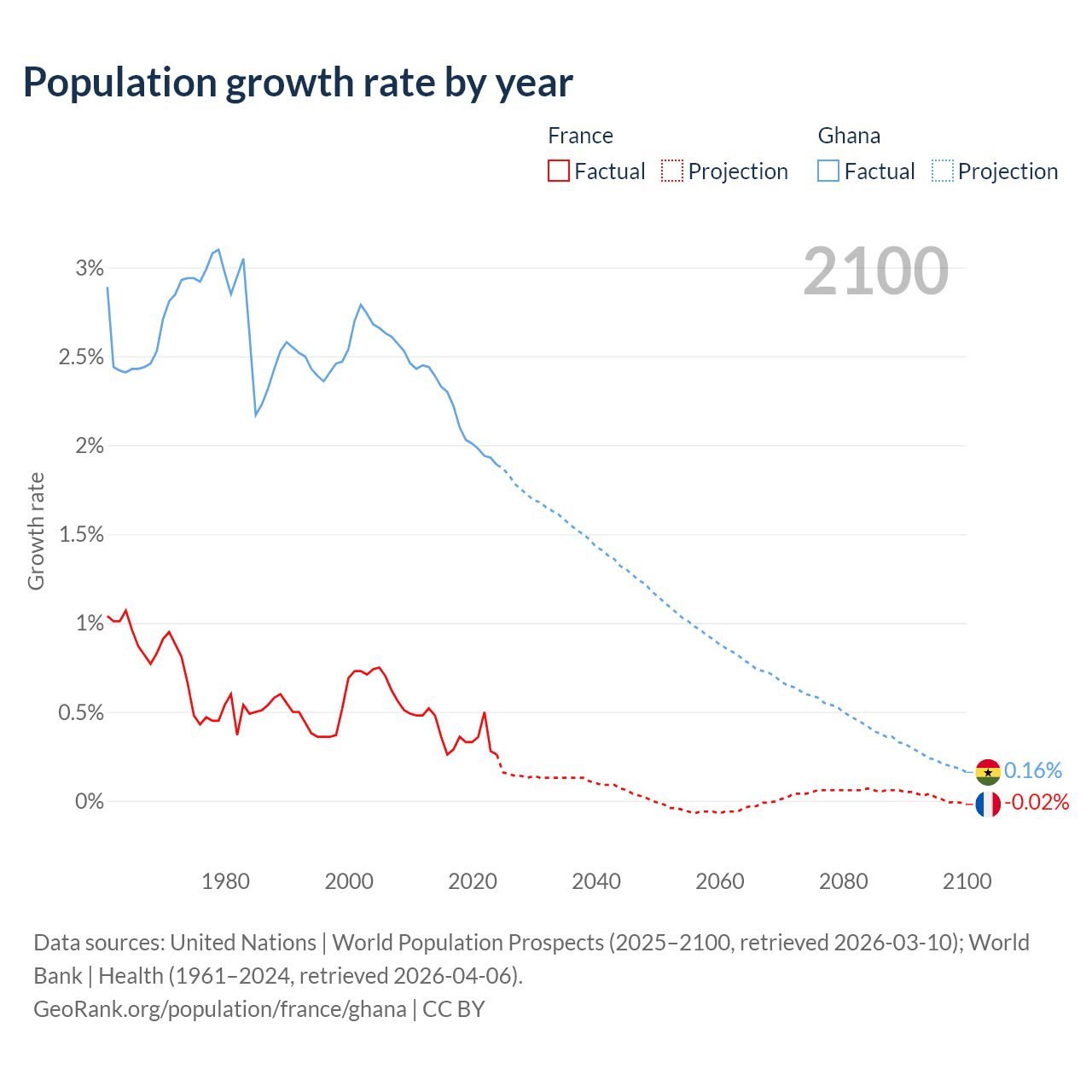- For the last 10 years, France has had an average growth rate of +0.35% per year vs +2.1% in Ghana.