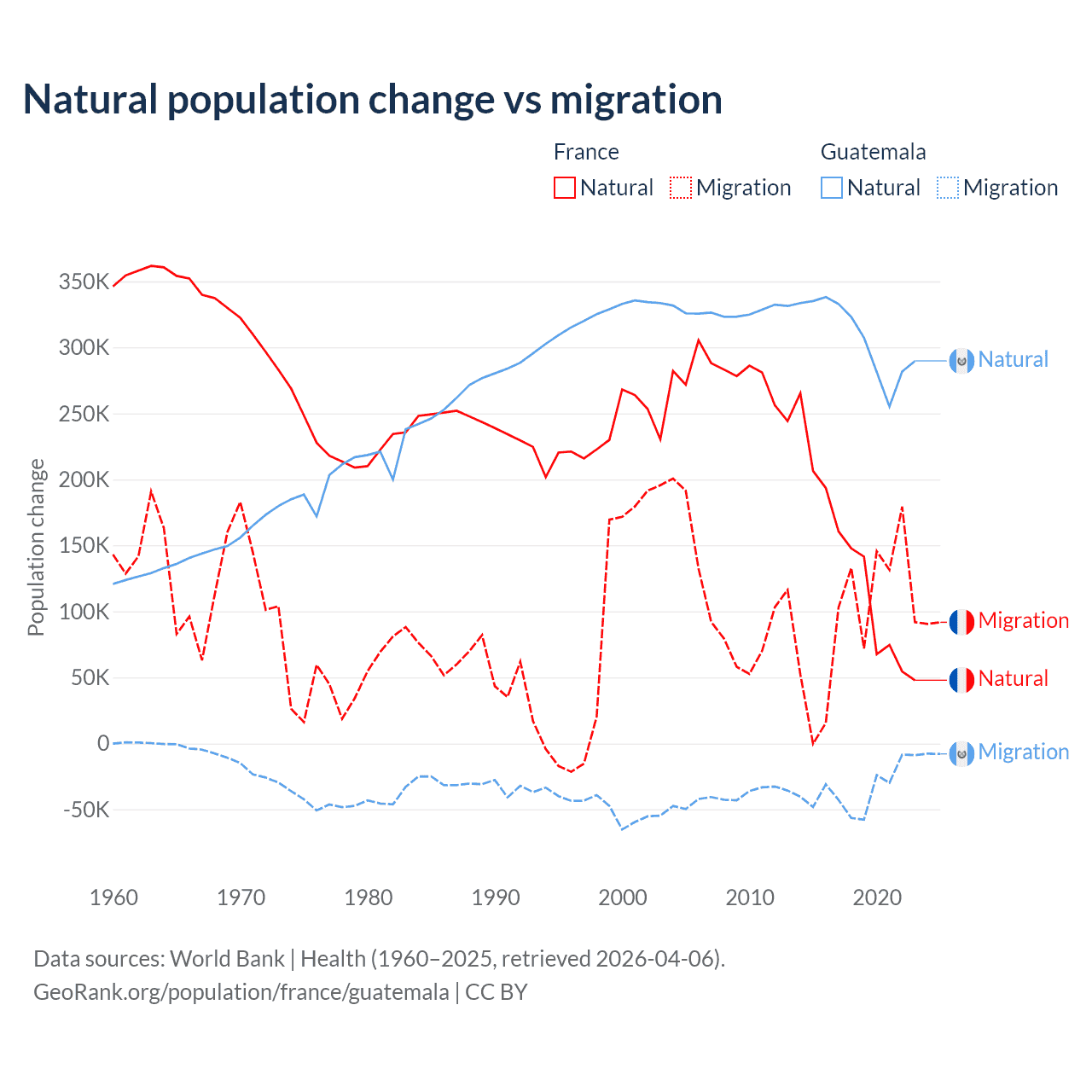 Over the last 10 years, 59.5% of the population change in France is from natural causes (a gain of 1,359,540 people) and 40.5% is from migration (a gain of 923,723 people). In Guatemala 89.8% is from natural causes (a gain of 3,077,847 people) and 10.2% is from migration (a loss of 347,818 people).