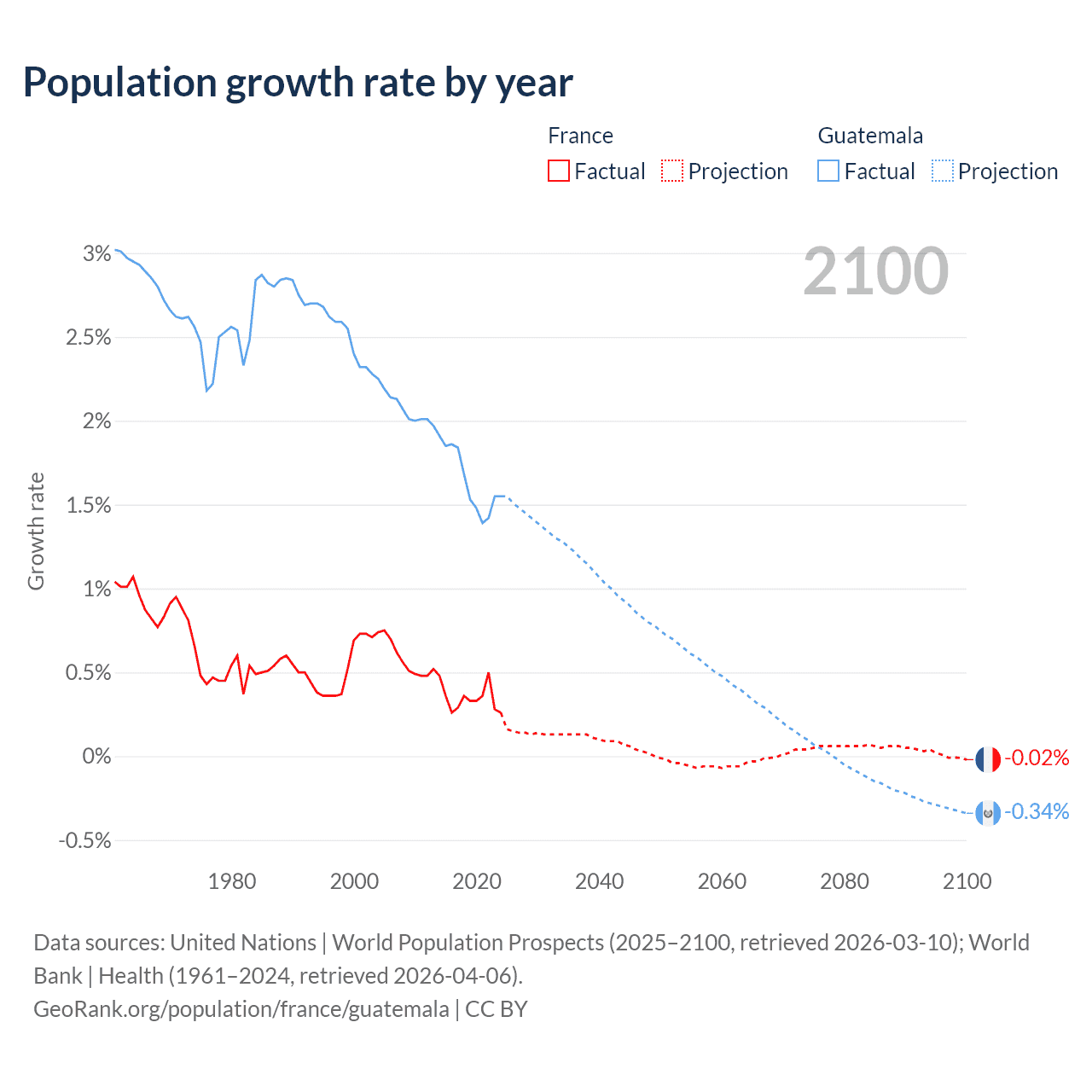 - For the last 10 years, France has had an average growth rate of +0.35% per year vs +1.64% in Guatemala.