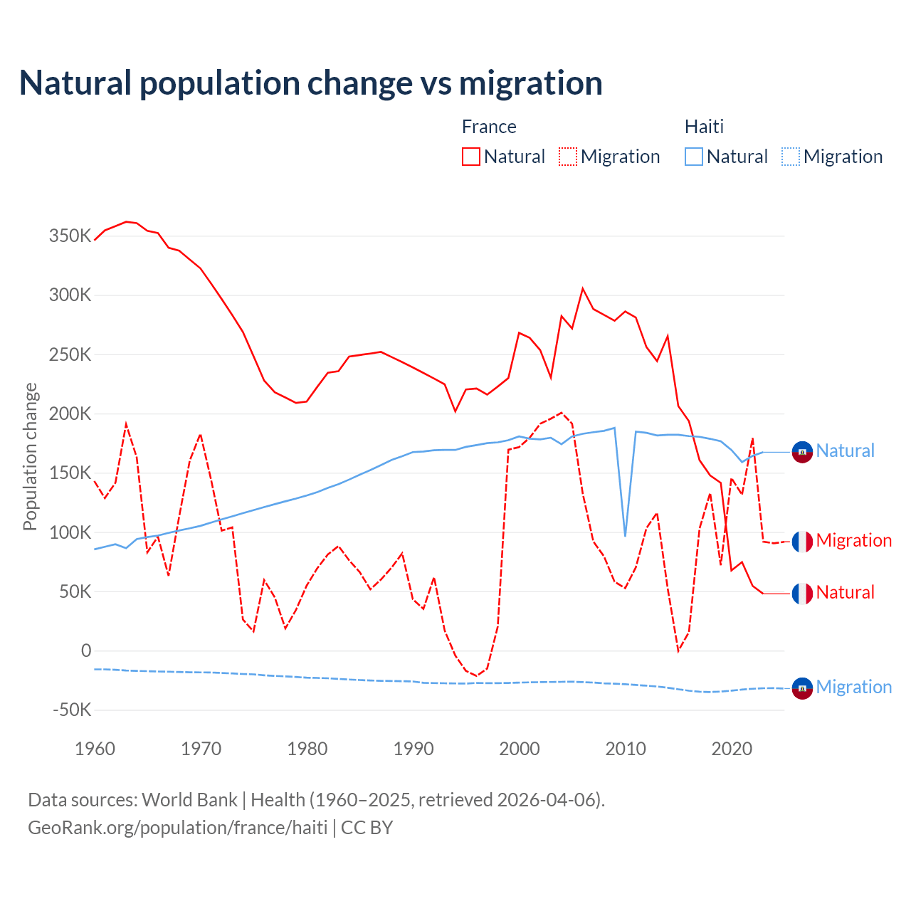 Over the last 10 years, 59.5% of the population change in France is from natural causes (a gain of 1,359,540 people) and 40.5% is from migration (a gain of 923,723 people). In Haiti 83.9% is from natural causes (a gain of 1,740,319 people) and 16.1% is from migration (a loss of 333,076 people).