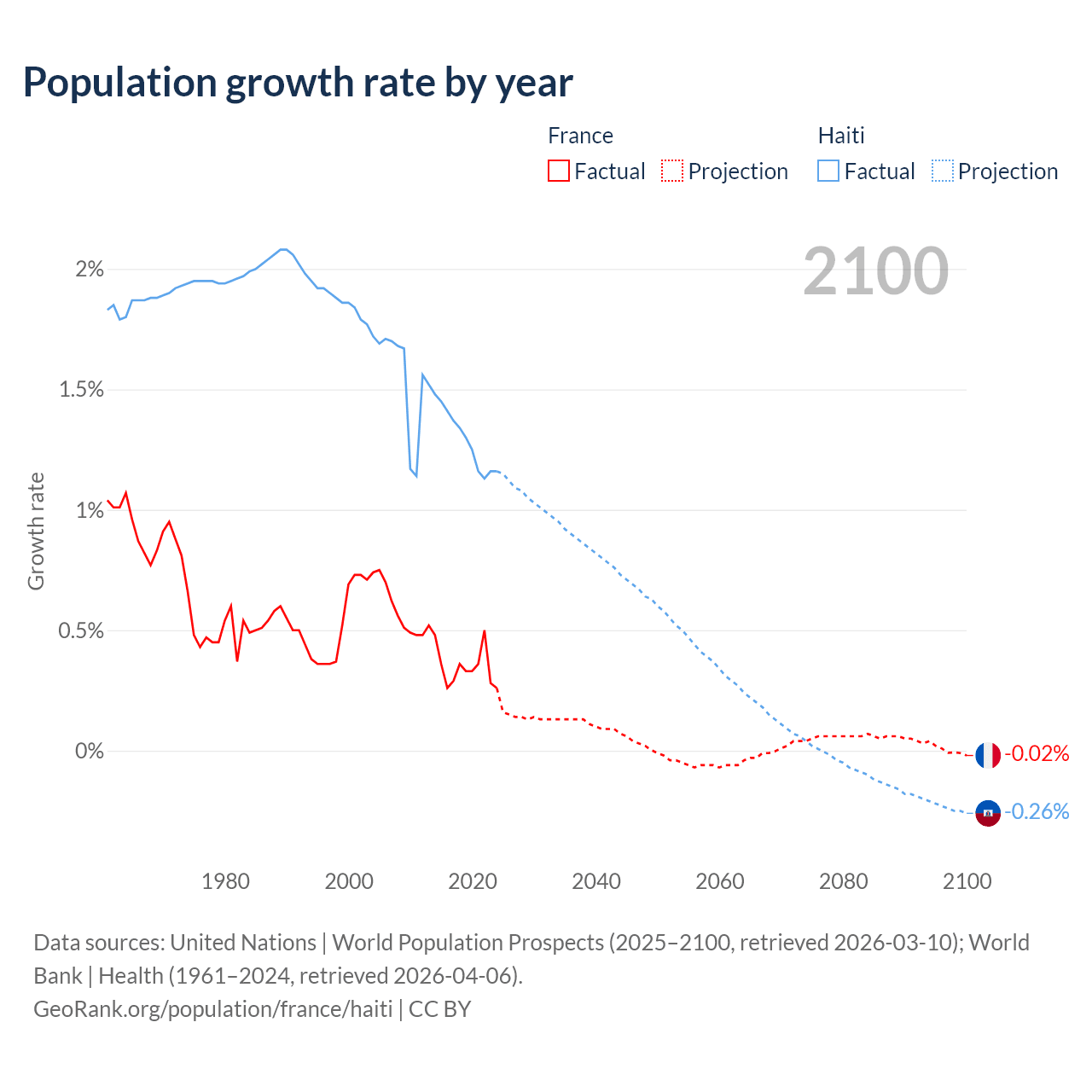 - For the last 10 years, France has had an average growth rate of +0.35% per year vs +1.29% in Haiti.
