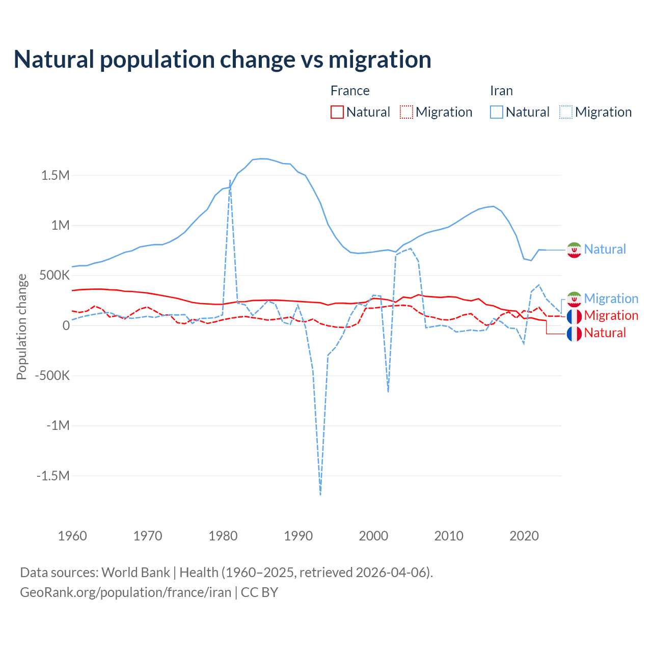 Over the last 10 years, 59.5% of the population change in France is from natural causes (a gain of 1,359,540 people) and 40.5% is from migration (a gain of 923,723 people). In Iran 92.5% is from natural causes (a gain of 9,405,860 people) and 7.46% is from migration (a gain of 757,979 people).