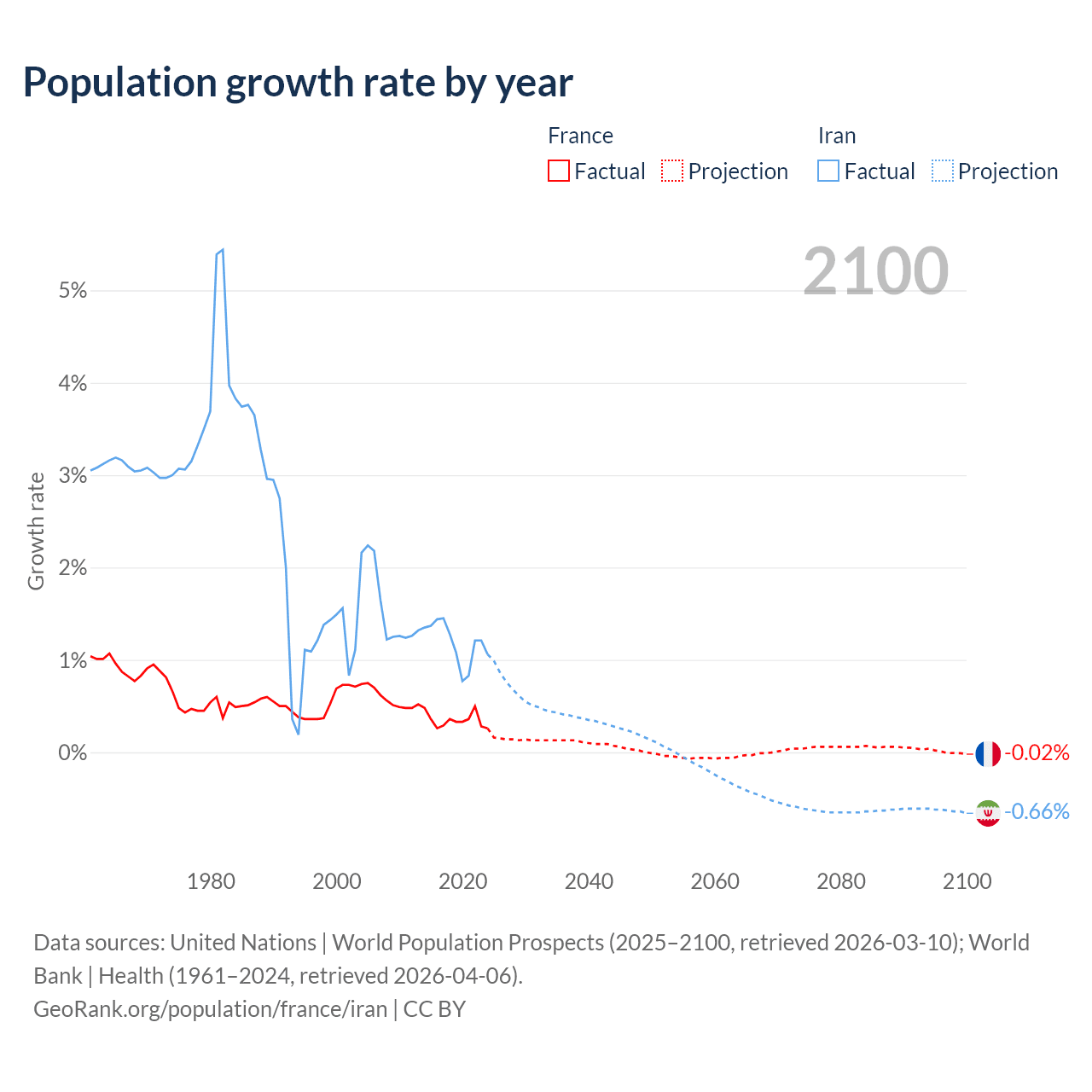 - For the last 10 years, France has had an average growth rate of +0.35% per year vs +1.19% in Iran.