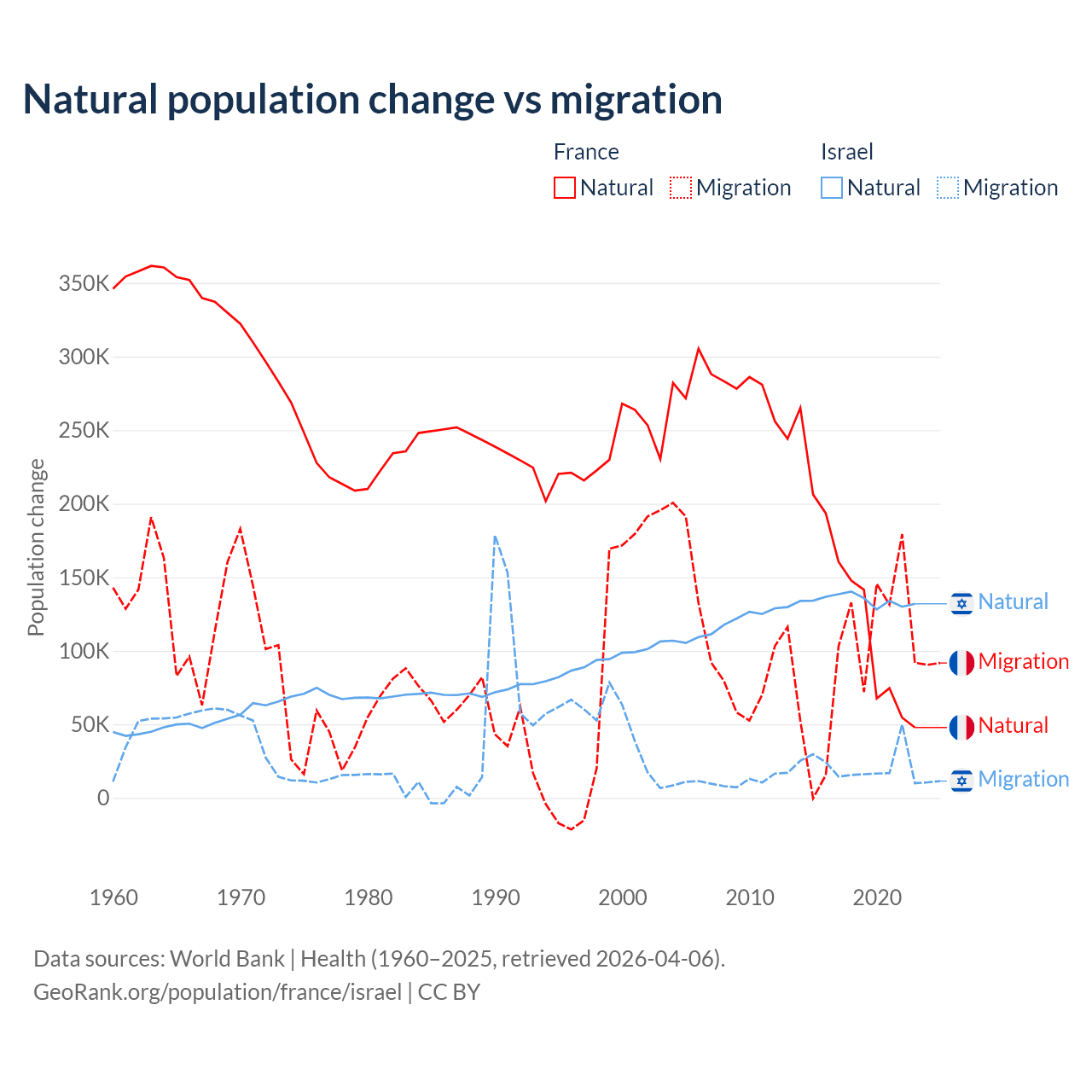 Over the last 10 years, 59.5% of the population change in France is from natural causes (a gain of 1,359,540 people) and 40.5% is from migration (a gain of 923,723 people). In Israel 86% is from natural causes (a gain of 1,343,492 people) and 14% is from migration (a gain of 219,048 people).
