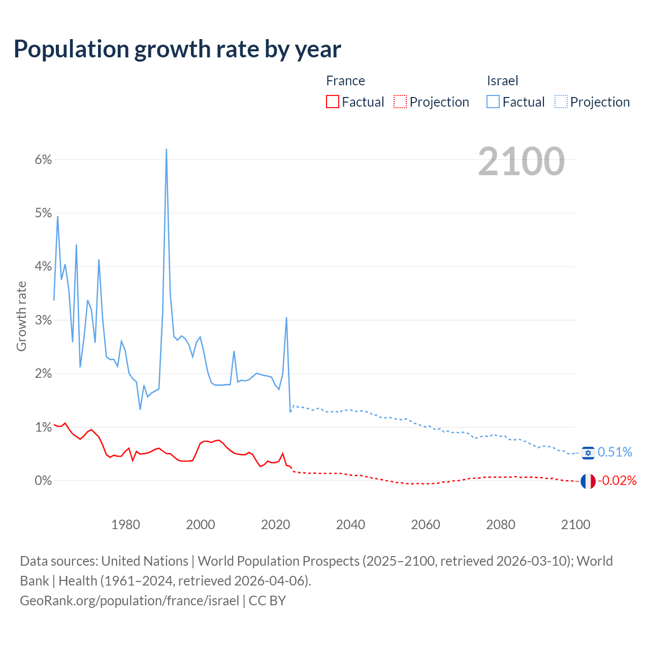 - For the last 10 years, France has had an average growth rate of +0.35% per year vs +1.96% in Israel.
