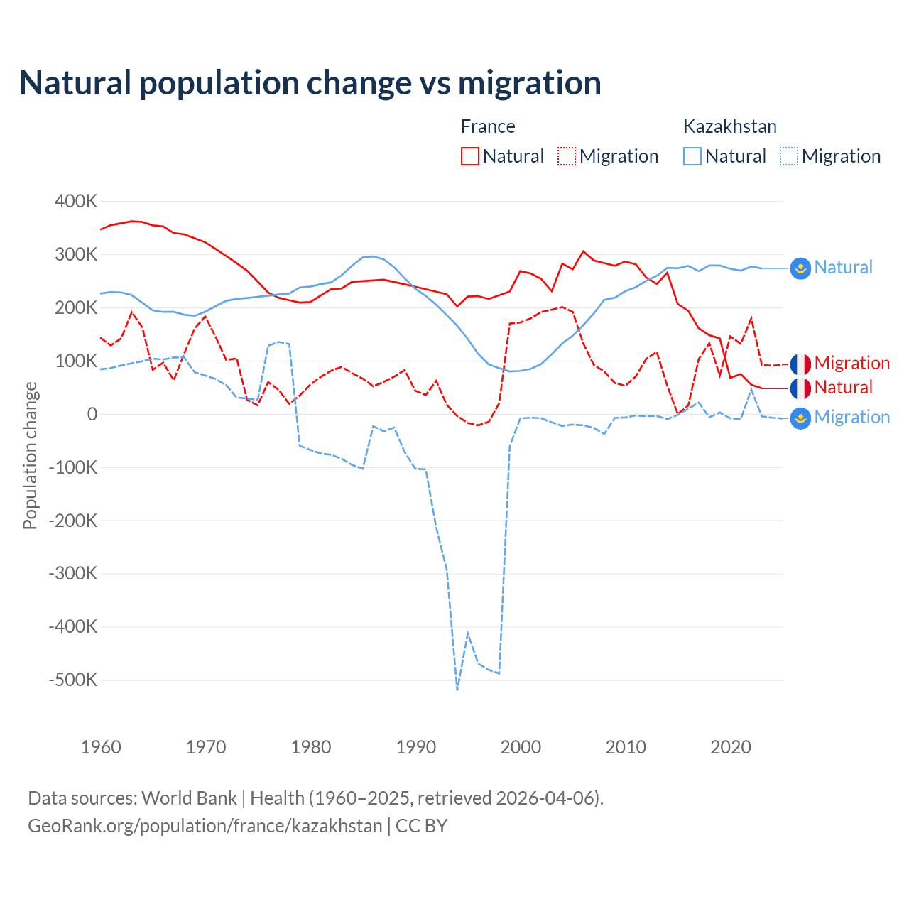 Over the last 10 years, 59.5% of the population change in France is from natural causes (a gain of 1,359,540 people) and 40.5% is from migration (a gain of 923,723 people). In Kazakhstan 98.7% is from natural causes (a gain of 2,743,094 people) and 1.33% is from migration (a gain of 36,908 people).