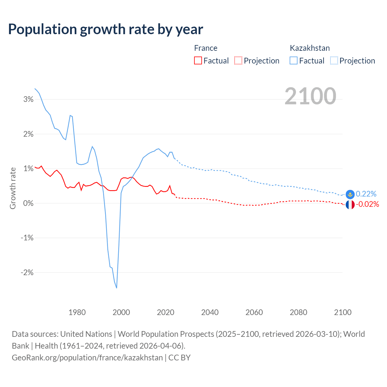 - For the last 10 years, France has had an average growth rate of +0.35% per year vs +1.46% in Kazakhstan.