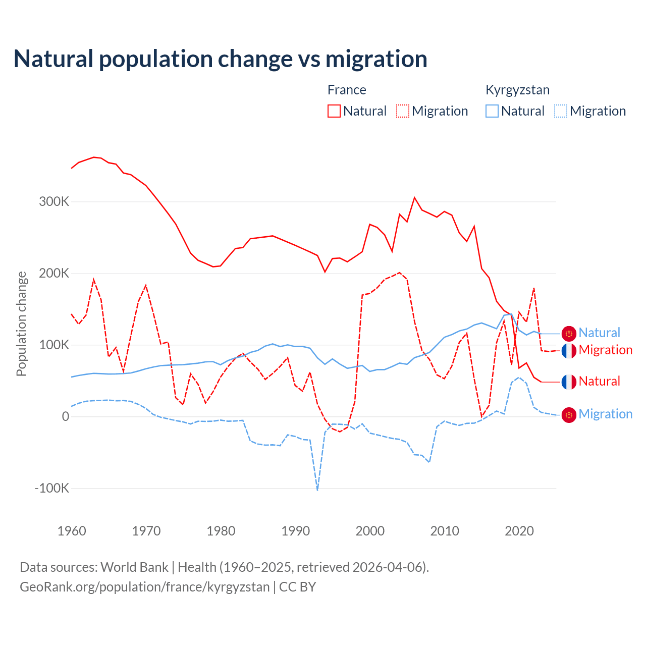 Over the last 10 years, 59.5% of the population change in France is from natural causes (a gain of 1,359,540 people) and 40.5% is from migration (a gain of 923,723 people). In Kyrgyzstan 88.5% is from natural causes (a gain of 1,258,837 people) and 11.5% is from migration (a gain of 164,132 people).