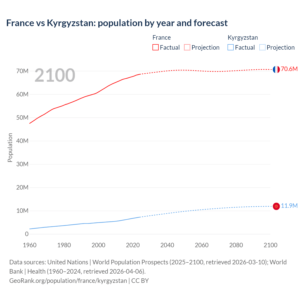 France vs Kyrgyzstan: population by year and forecast