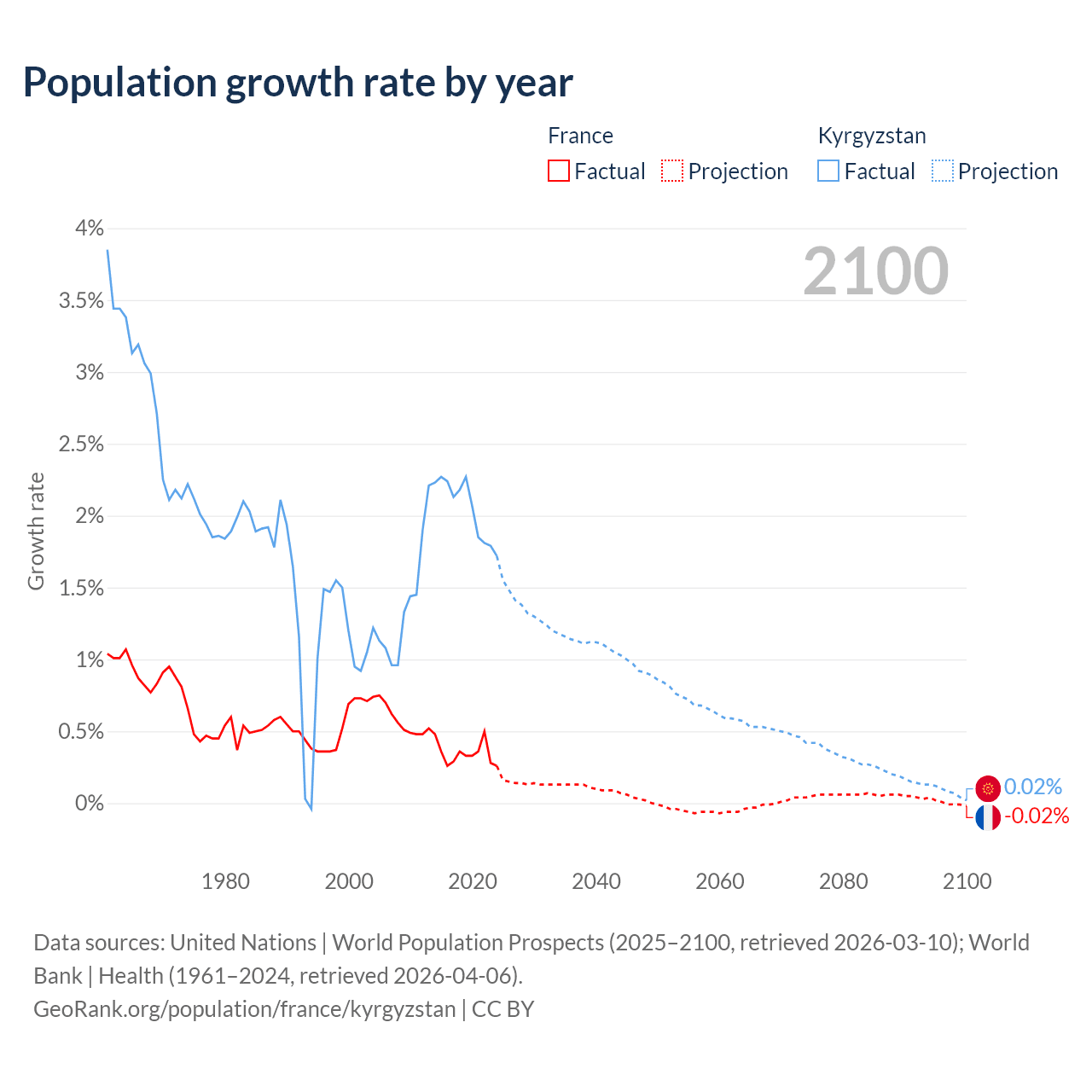 - For the last 10 years, France has had an average growth rate of +0.35% per year vs +2.05% in Kyrgyzstan.