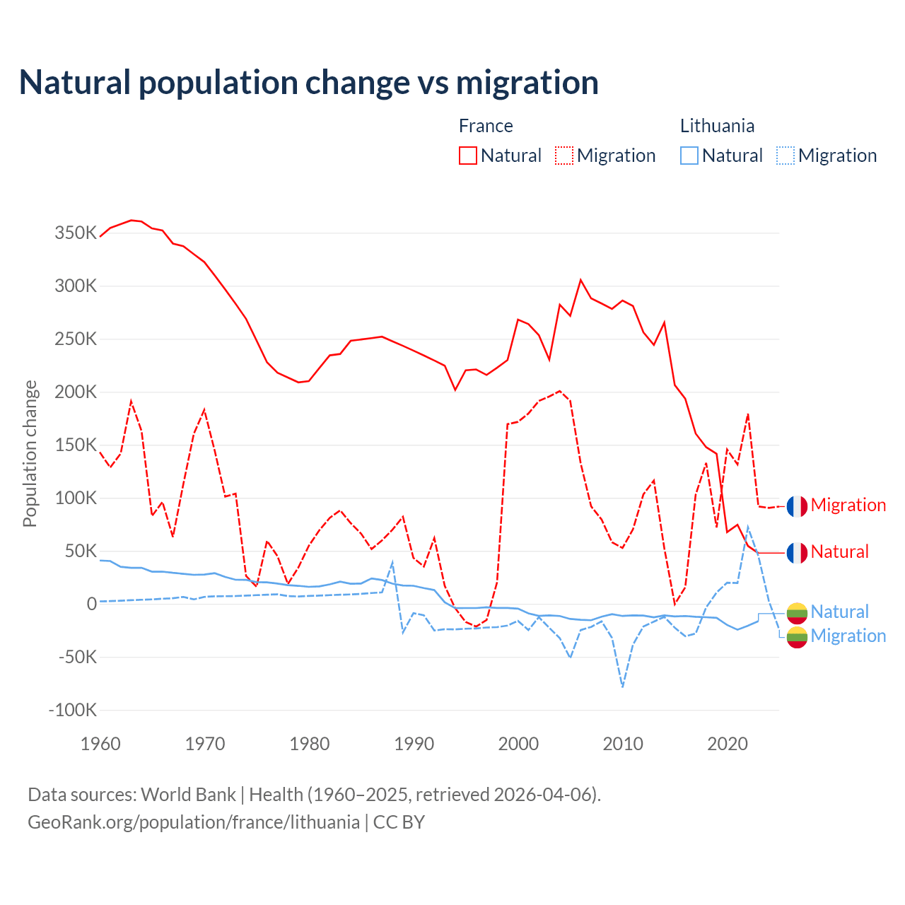 Over the last 10 years, 59.5% of the population change in France is from natural causes (a gain of 1,359,540 people) and 40.5% is from migration (a gain of 923,723 people). In Lithuania 68.7% is from natural causes (a loss of 153,859 people) and 31.3% is from migration (a gain of 70,196 people).