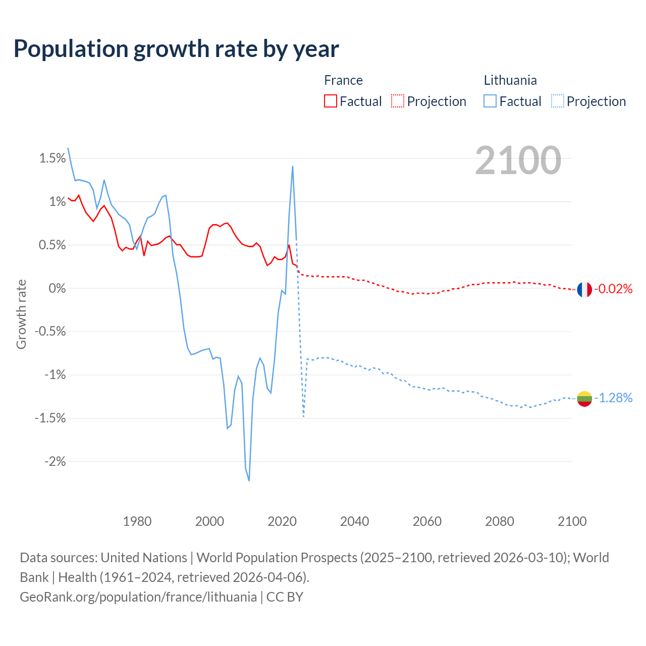 - For the last 10 years, France has had an average growth rate of +0.35% per year vs -0.22% in Lithuania.