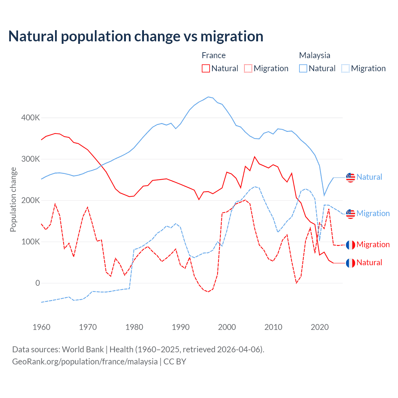 Over the last 10 years, 59.5% of the population change in France is from natural causes (a gain of 1,359,540 people) and 40.5% is from migration (a gain of 923,723 people). In Malaysia 61.7% is from natural causes (a gain of 3,029,648 people) and 38.3% is from migration (a gain of 1,882,159 people).