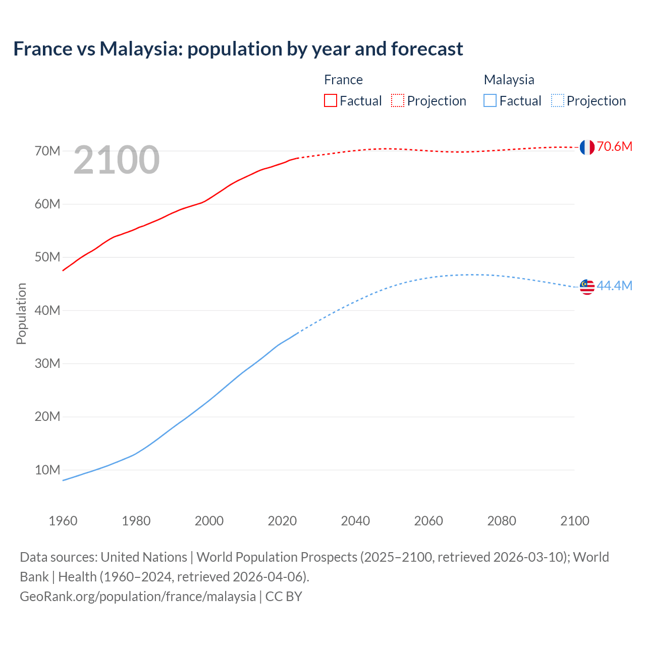 The latest officially reported population of France was 68,551,653 in 2024 vs 35,557,673 people in Malaysia in 2024. In 2026, based on the adjusted UN estimation, the current France's population is 68,788,006 people compared to 36,512,221 in Malaysia.