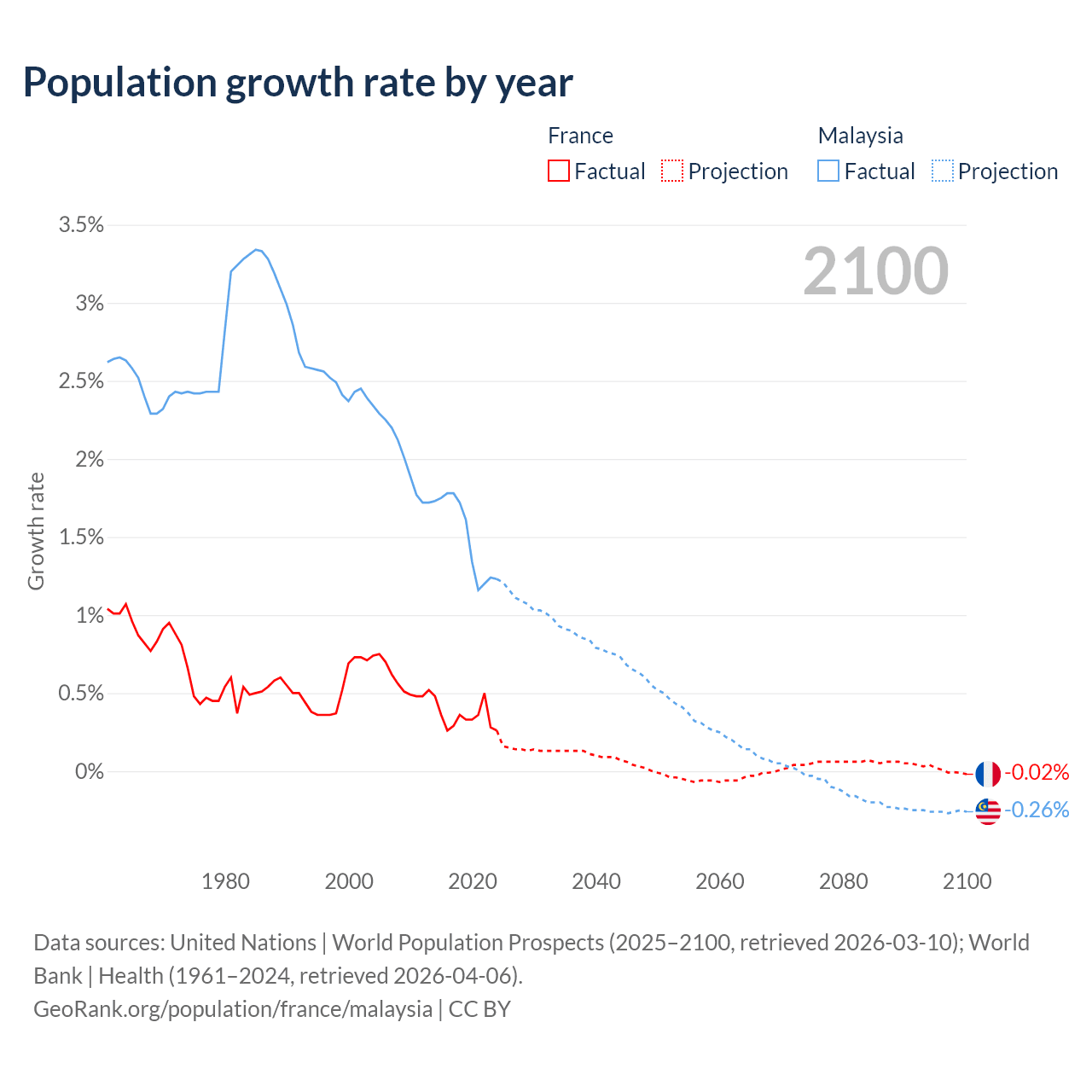 - For the last 10 years, France has had an average growth rate of +0.35% per year vs +1.5% in Malaysia.