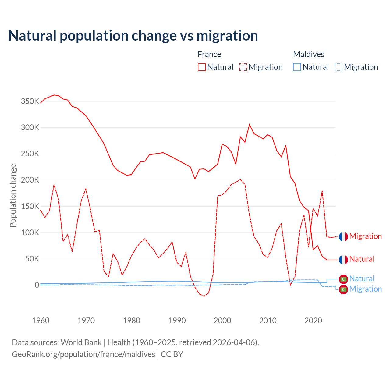 Over the last 10 years, 59.5% of the population change in France is from natural causes (a gain of 1,359,540 people) and 40.5% is from migration (a gain of 923,723 people). In Maldives 42.7% is from natural causes (a gain of 51,342 people) and 57.3% is from migration (a gain of 68,788 people).