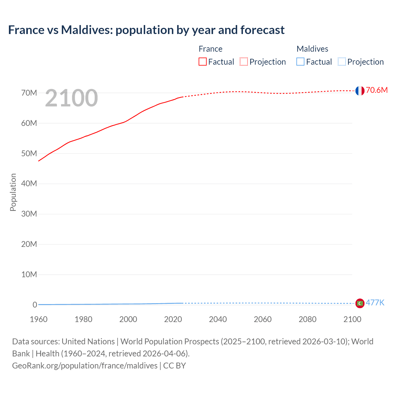 The latest officially reported population of France was 68,551,653 in 2024 vs 527,799 people in Maldives in 2024. In 2026, based on the adjusted UN estimation, the current France's population is 68,788,006 people compared to 532,057 in Maldives.
