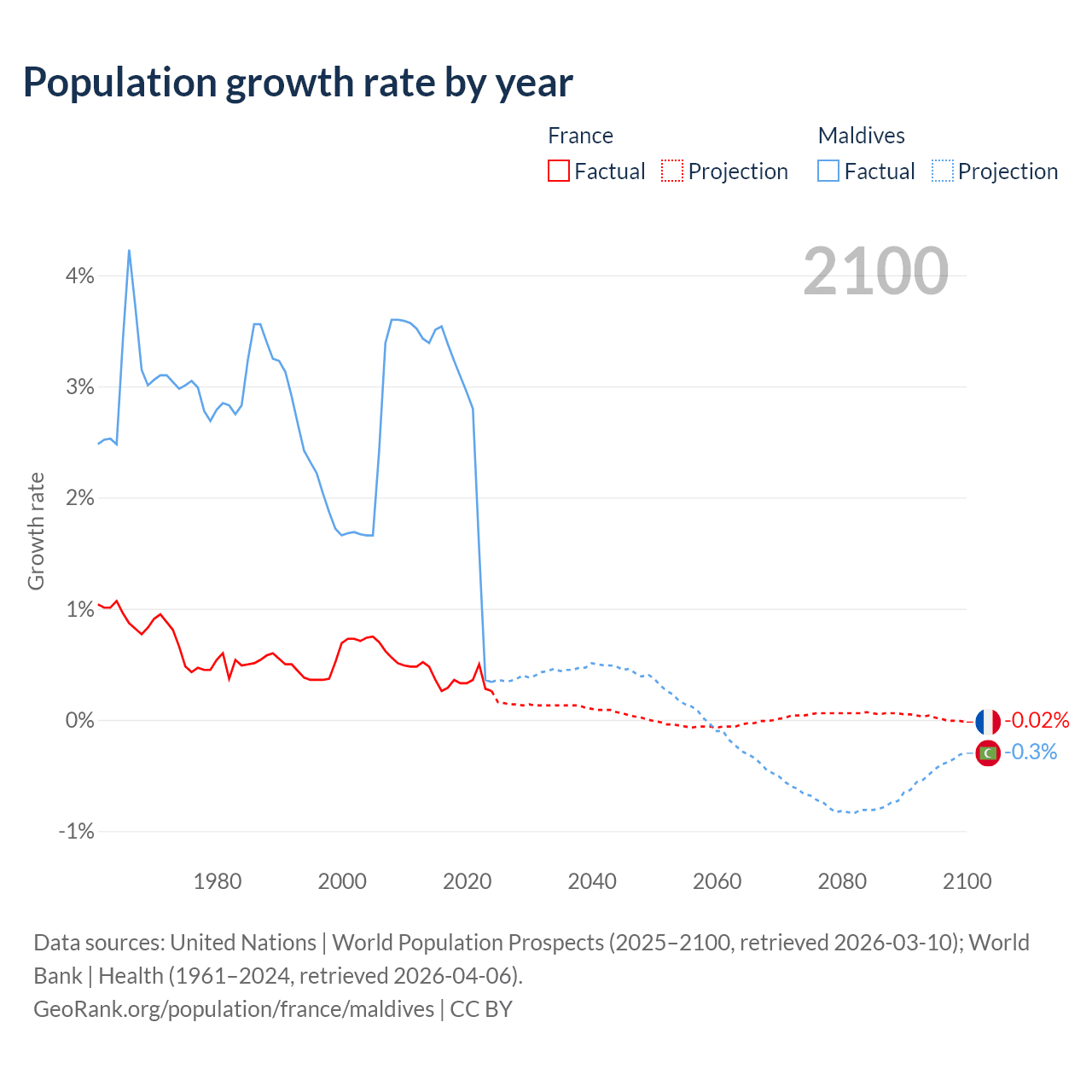- For the last 10 years, France has had an average growth rate of +0.35% per year vs +2.56% in Maldives.