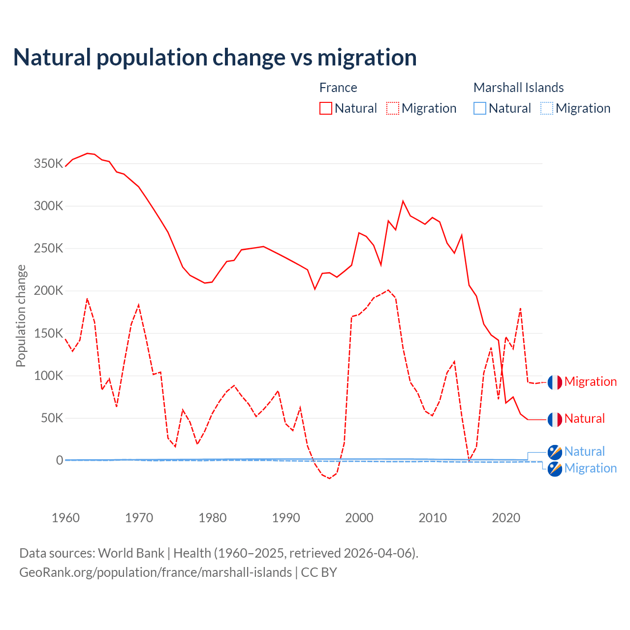 Over the last 10 years, 59.5% of the population change in France is from natural causes (a gain of 1,359,540 people) and 40.5% is from migration (a gain of 923,723 people). In the Marshall Islands 27.8% is from natural causes (a gain of 7,592 people) and 72.2% is from migration (a loss of 19,682 people).