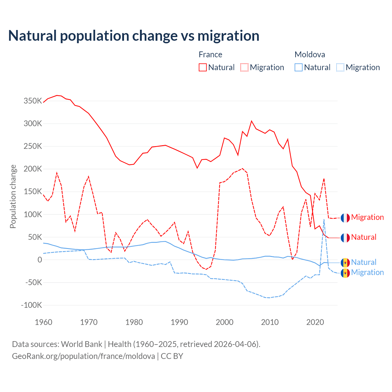 Over the last 10 years, 59.5% of the population change in France is from natural causes (a gain of 1,359,540 people) and 40.5% is from migration (a gain of 923,723 people). In Moldova 6.04% is from natural causes (a loss of 19,001 people) and 94% is from migration (a loss of 295,631 people).