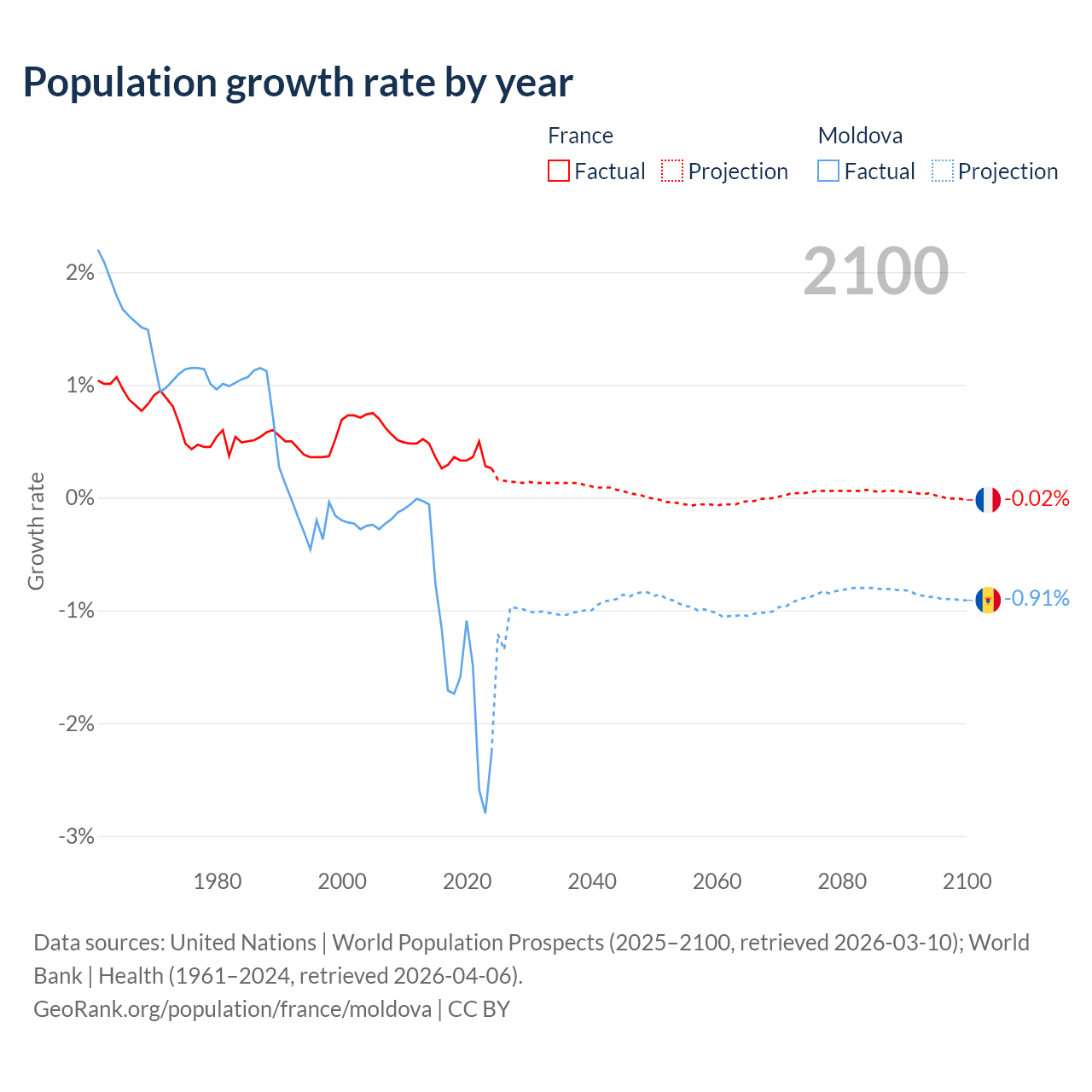 - For the last 10 years, France has had an average growth rate of +0.35% per year vs -1.57% in Moldova.