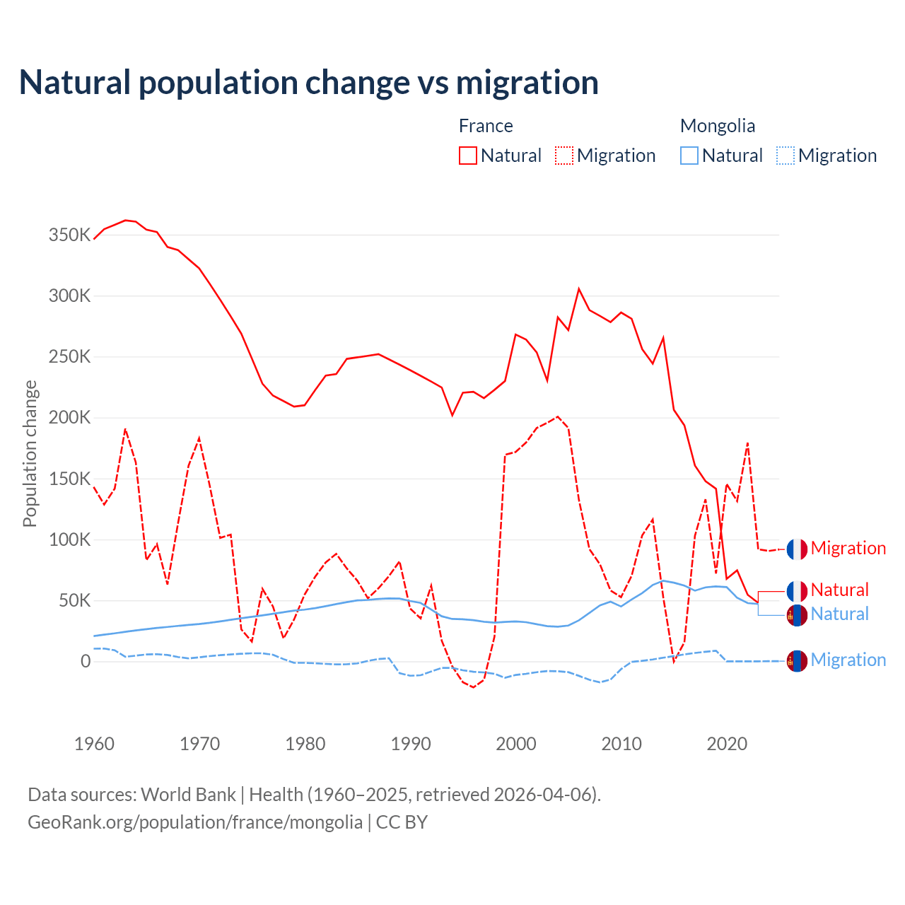 Over the last 10 years, 59.5% of the population change in France is from natural causes (a gain of 1,359,540 people) and 40.5% is from migration (a gain of 923,723 people). In Mongolia 94.1% is from natural causes (a gain of 580,367 people) and 5.87% is from migration (a gain of 36,163 people).