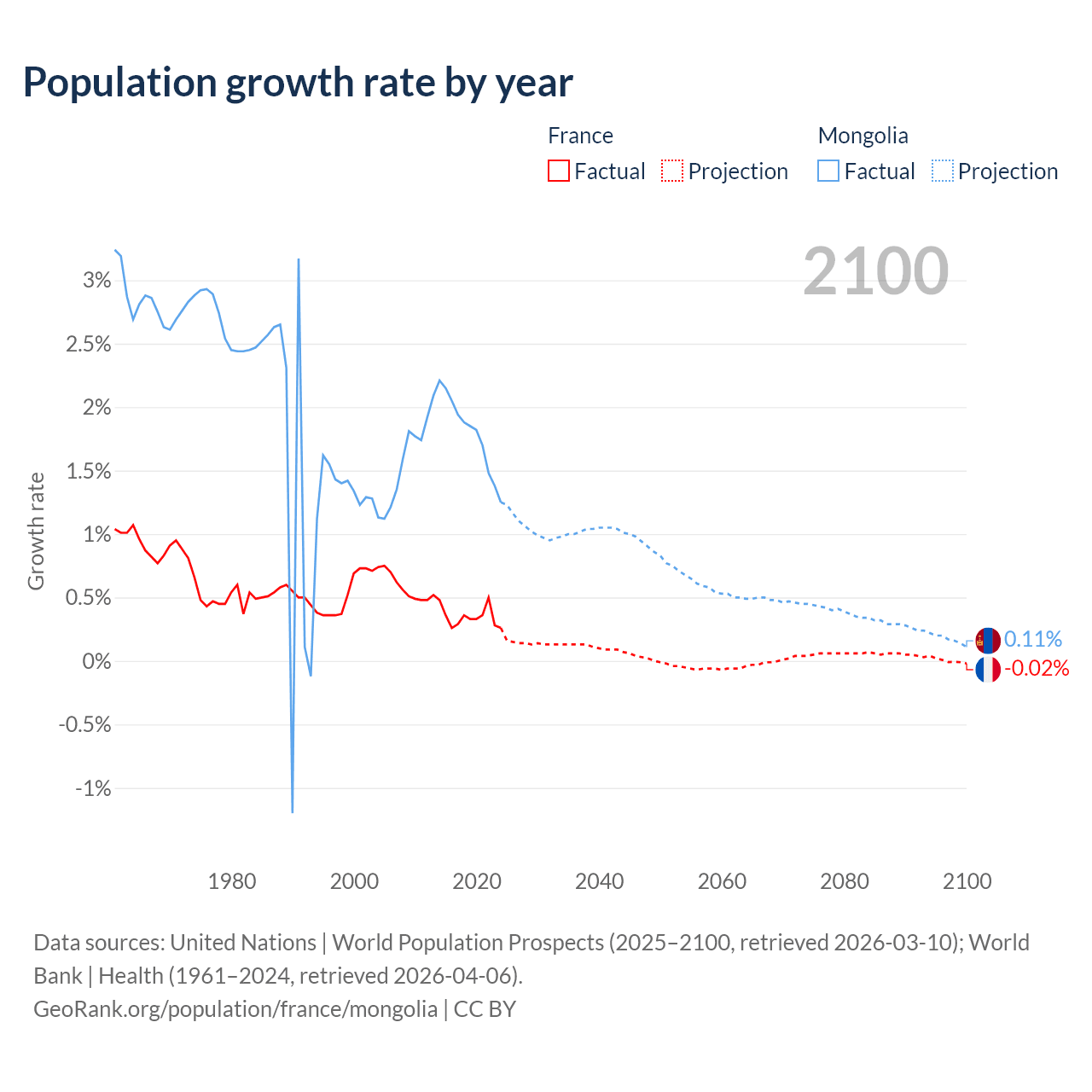 - For the last 10 years, France has had an average growth rate of +0.35% per year vs +1.79% in Mongolia.
