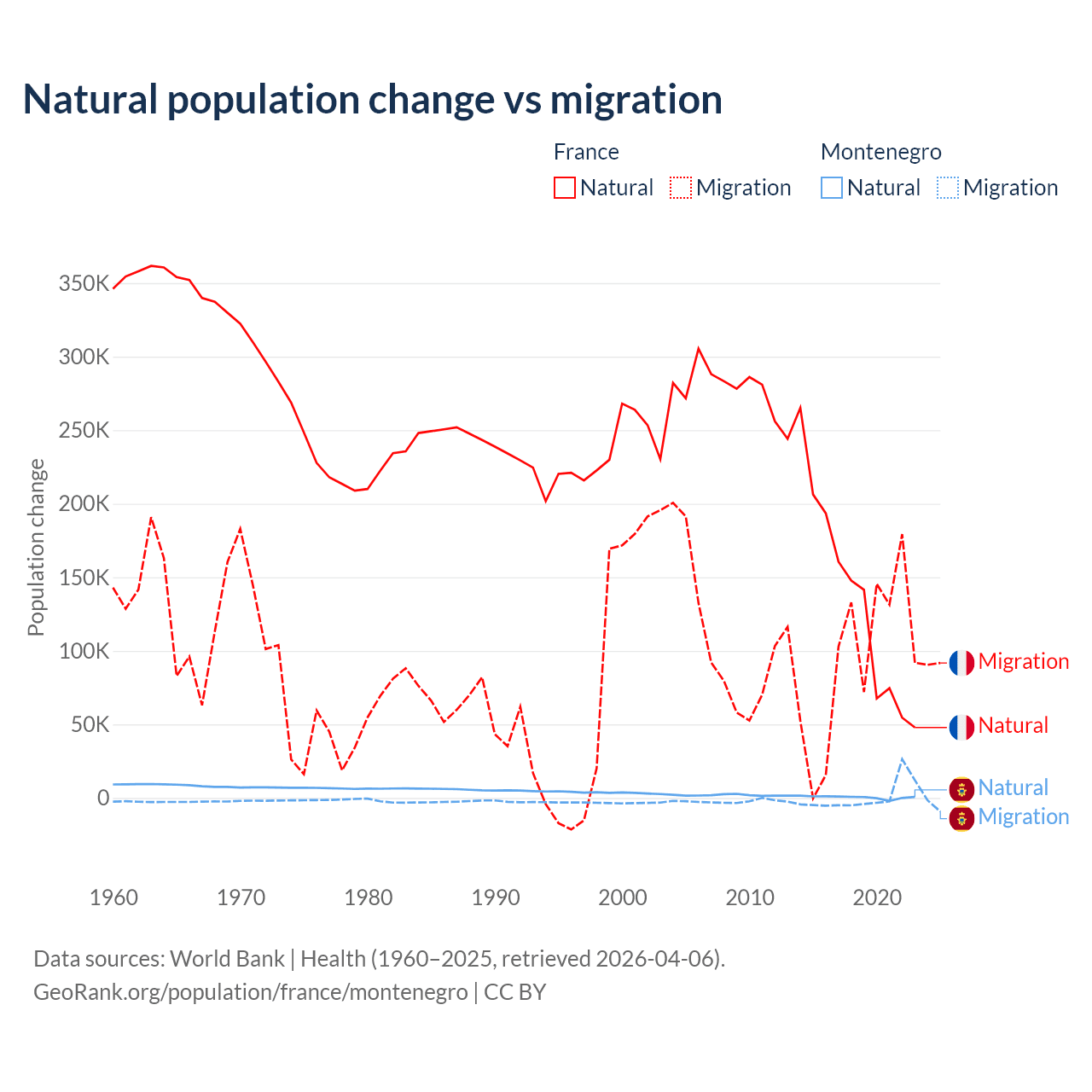 Over the last 10 years, 59.5% of the population change in France is from natural causes (a gain of 1,359,540 people) and 40.5% is from migration (a gain of 923,723 people). In Montenegro 52.4% is from natural causes (a gain of 4,501 people) and 47.6% is from migration (a gain of 4,095 people).