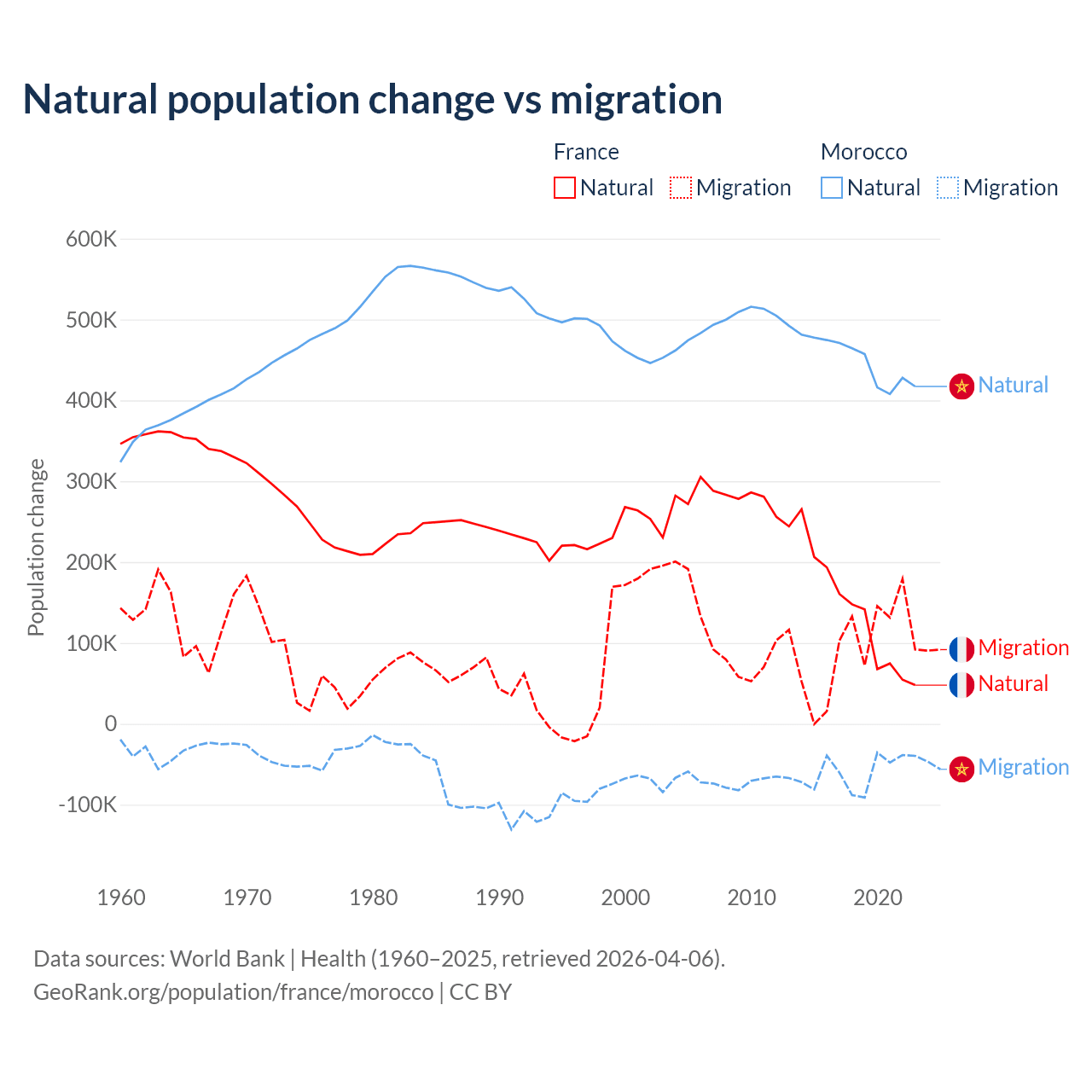Over the last 10 years, 59.5% of the population change in France is from natural causes (a gain of 1,359,540 people) and 40.5% is from migration (a gain of 923,723 people). In Morocco 88.3% is from natural causes (a gain of 4,495,223 people) and 11.7% is from migration (a loss of 594,083 people).