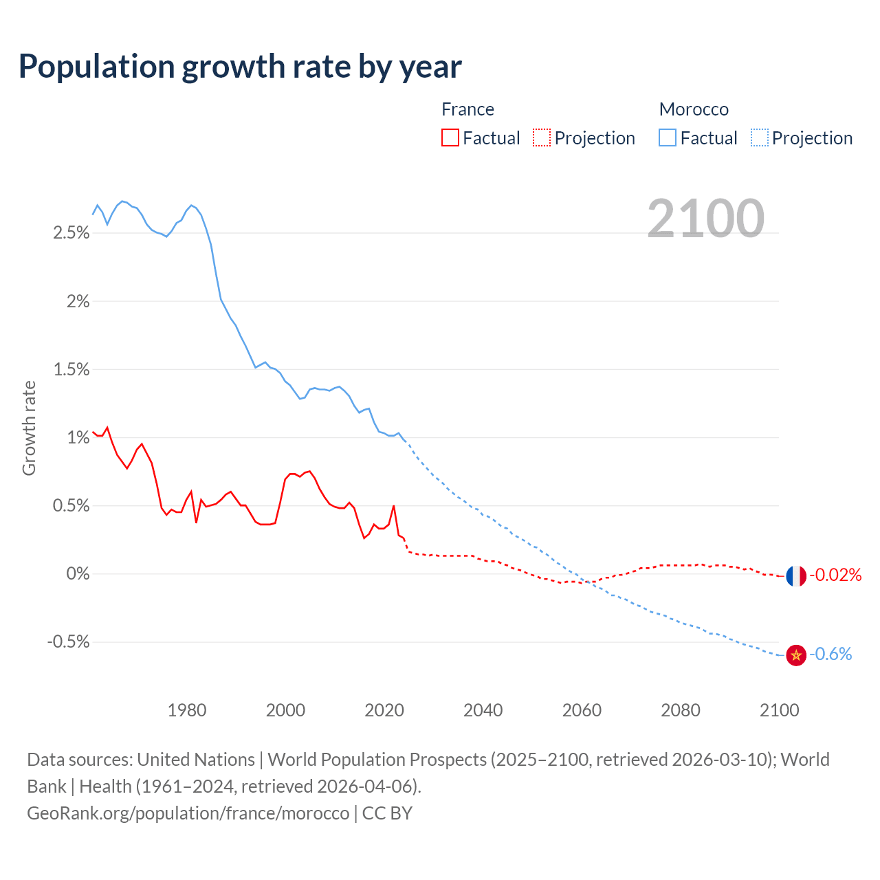 - For the last 10 years, France has had an average growth rate of +0.35% per year vs +1.09% in Morocco.