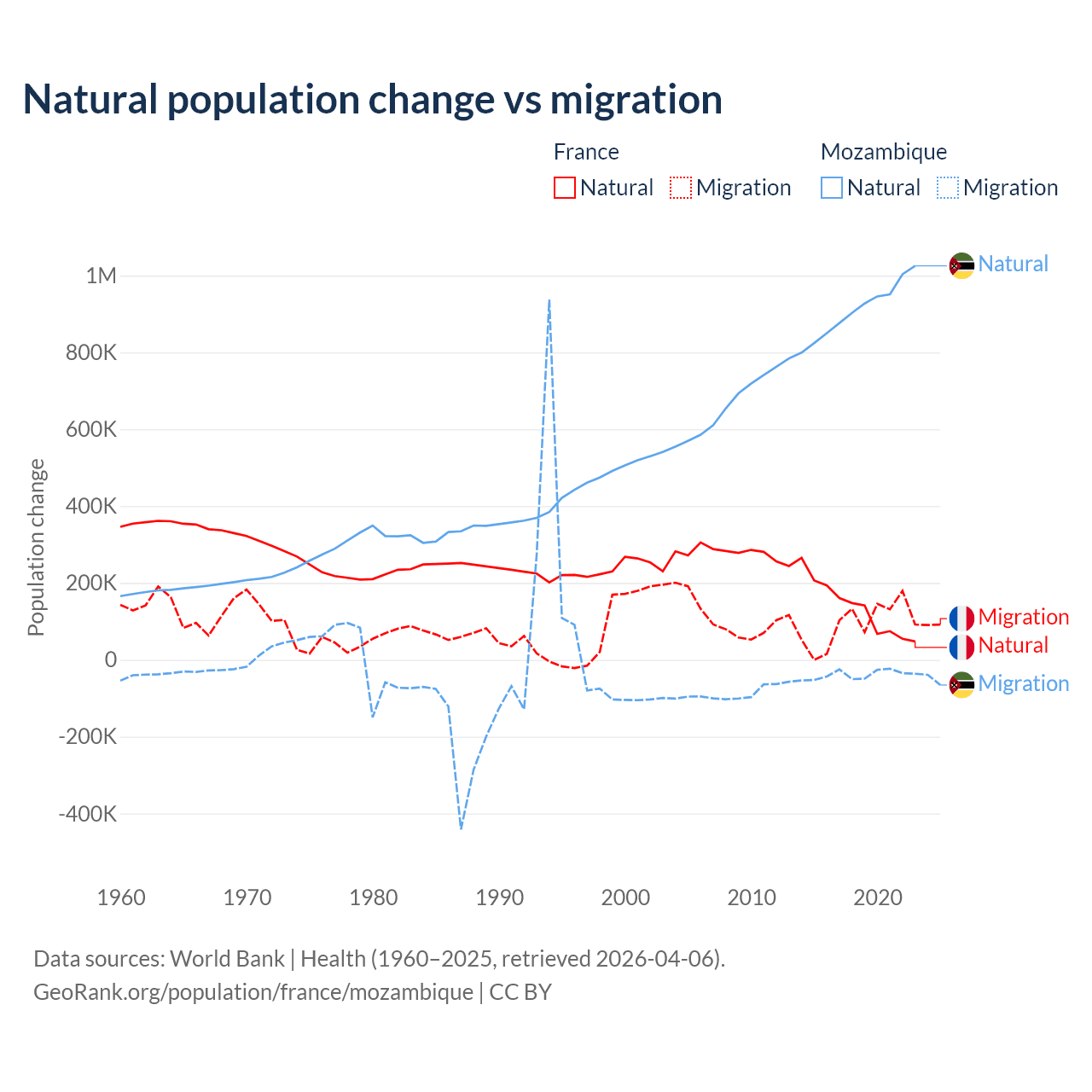 Over the last 10 years, 59.5% of the population change in France is from natural causes (a gain of 1,359,540 people) and 40.5% is from migration (a gain of 923,723 people). In Mozambique 95.9% is from natural causes (a gain of 9,108,203 people) and 4.15% is from migration (a loss of 393,923 people).