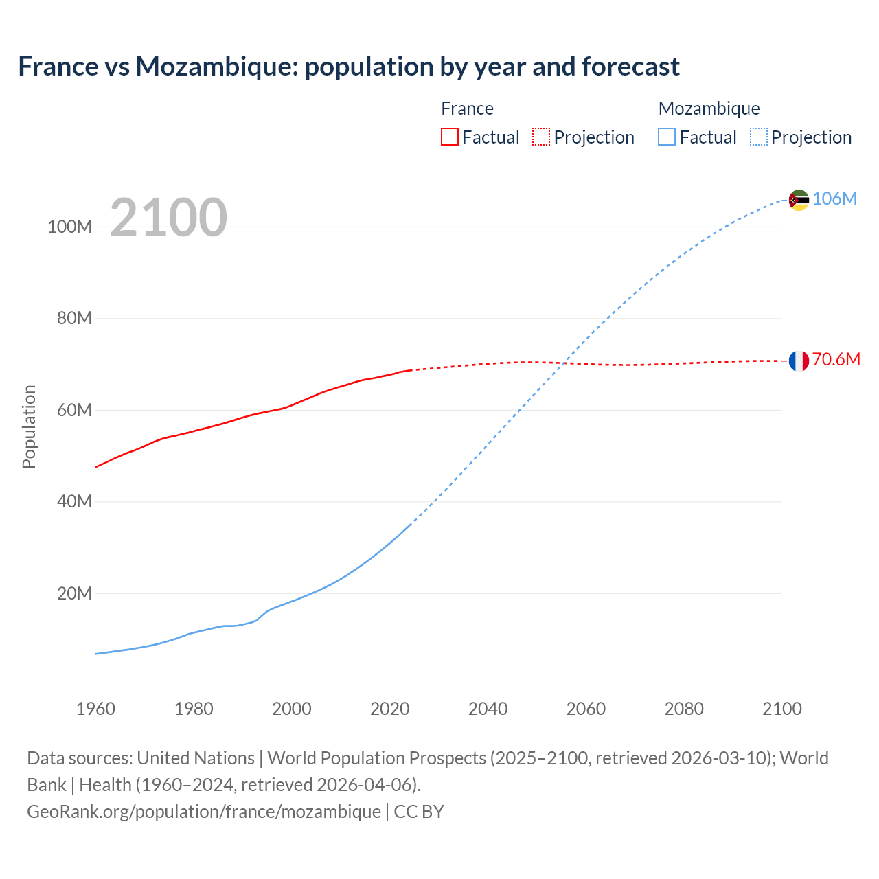 The latest officially reported population of France was 68,551,653 in 2024 vs 34,631,766 people in Mozambique in 2024. In 2026, based on the adjusted UN estimation, the current France's population is 68,788,006 people compared to 36,941,128 in Mozambique.