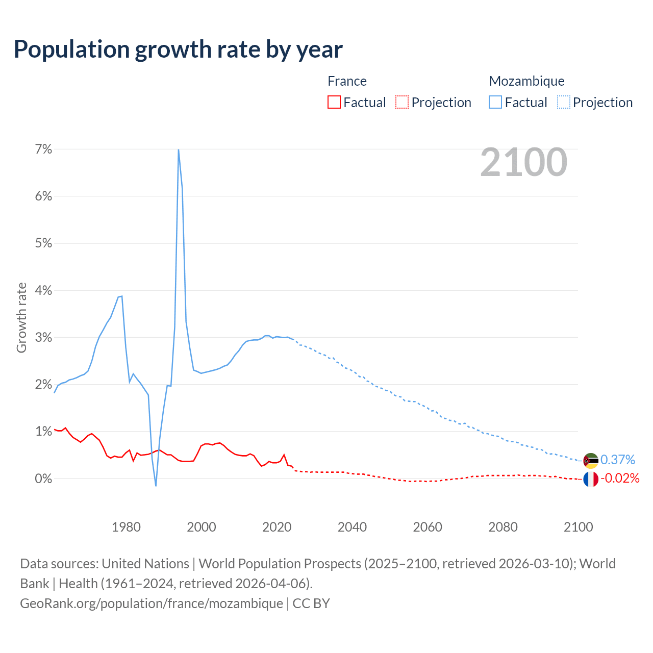 - For the last 10 years, France has had an average growth rate of +0.35% per year vs +2.99% in Mozambique.