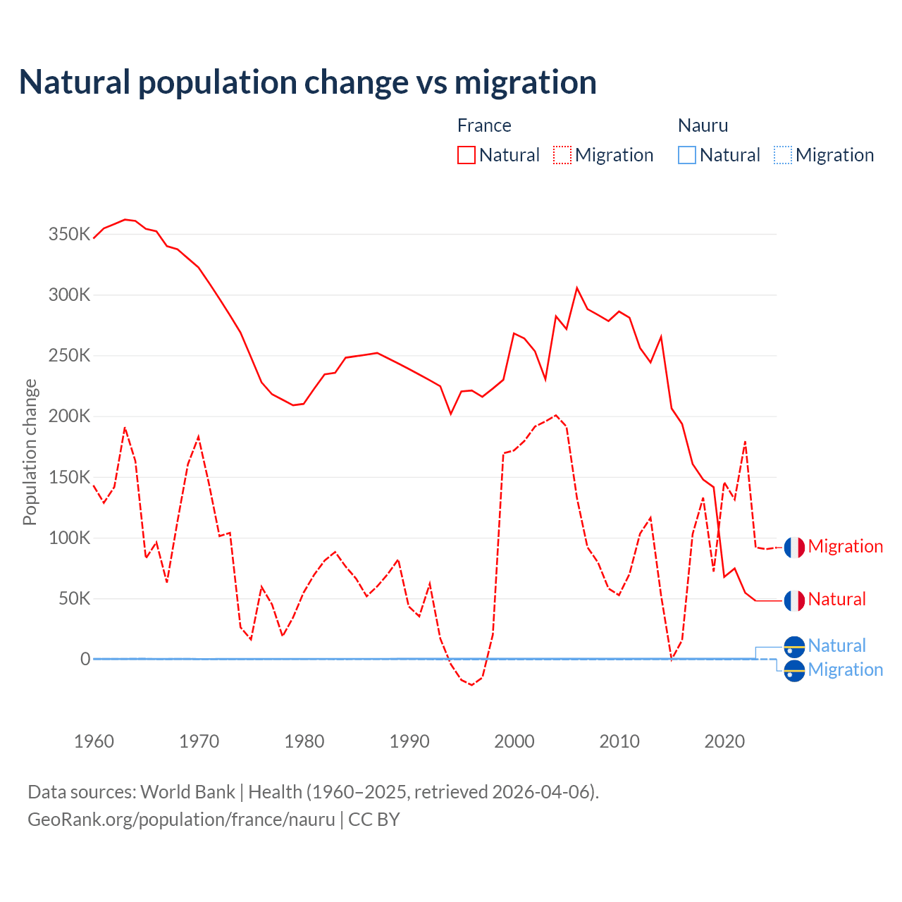 Over the last 10 years, 59.5% of the population change in France is from natural causes (a gain of 1,359,540 people) and 40.5% is from migration (a gain of 923,723 people). In Nauru 66.2% is from natural causes (a gain of 2,590 people) and 33.8% is from migration (a loss of 1,320 people).