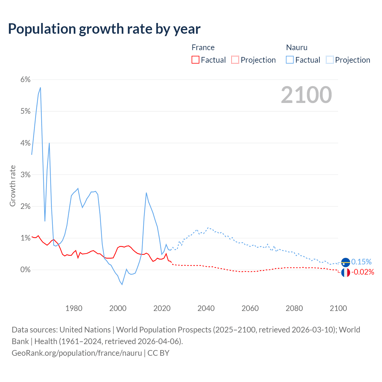 - For the last 10 years, France has had an average growth rate of +0.35% per year vs +1.17% in Nauru.