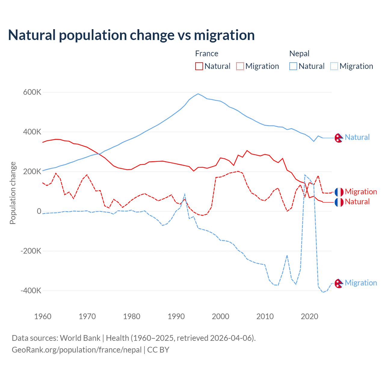 Over the last 10 years, 59.5% of the population change in France is from natural causes (a gain of 1,359,540 people) and 40.5% is from migration (a gain of 923,723 people). In Nepal 67.9% is from natural causes (a gain of 3,909,749 people) and 32.1% is from migration (a loss of 1,851,664 people).