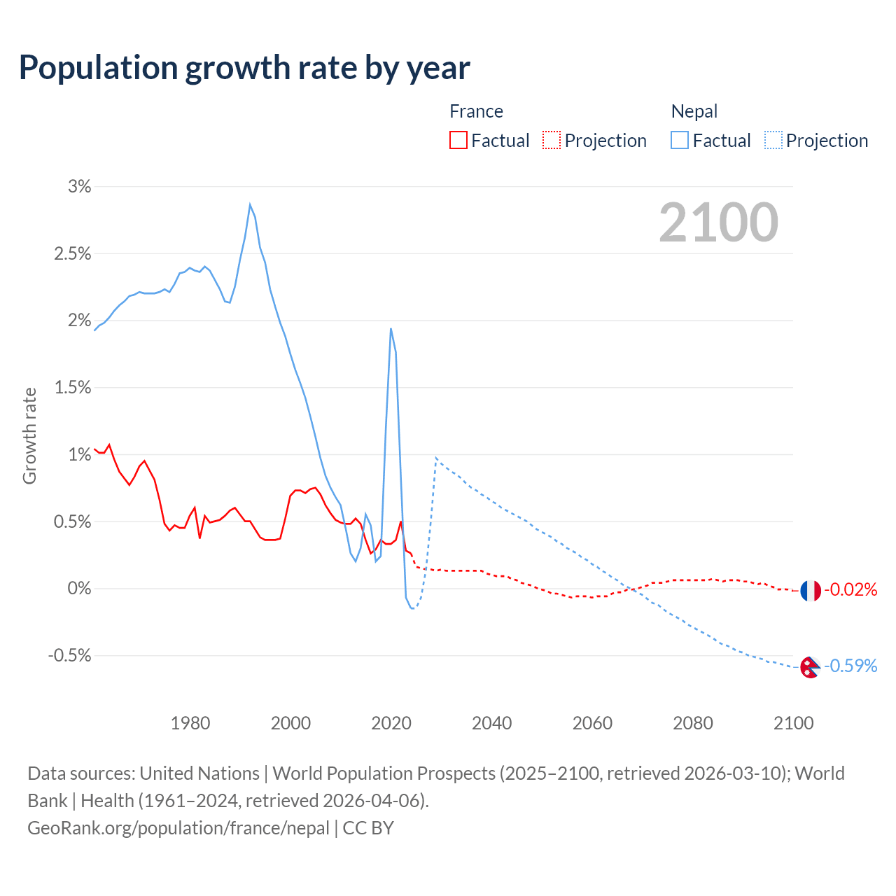 - For the last 10 years, France has had an average growth rate of +0.35% per year vs +0.66% in Nepal.