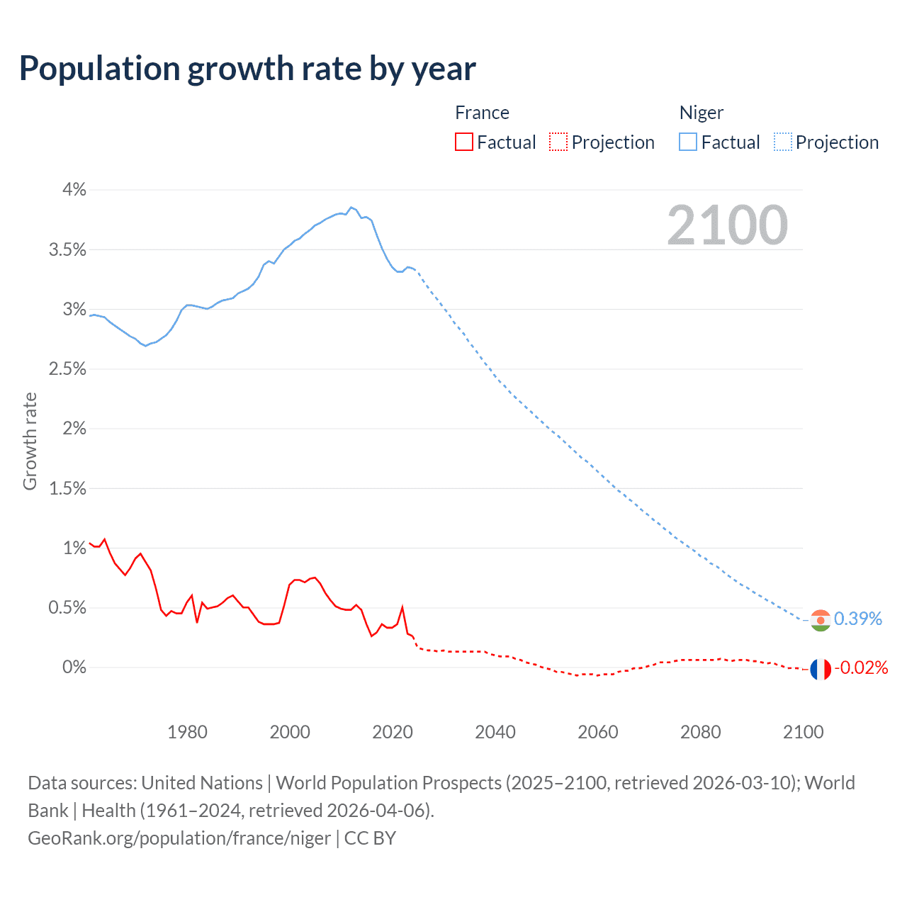 - For the last 10 years, France has had an average growth rate of +0.35% per year vs +3.5% in Niger.