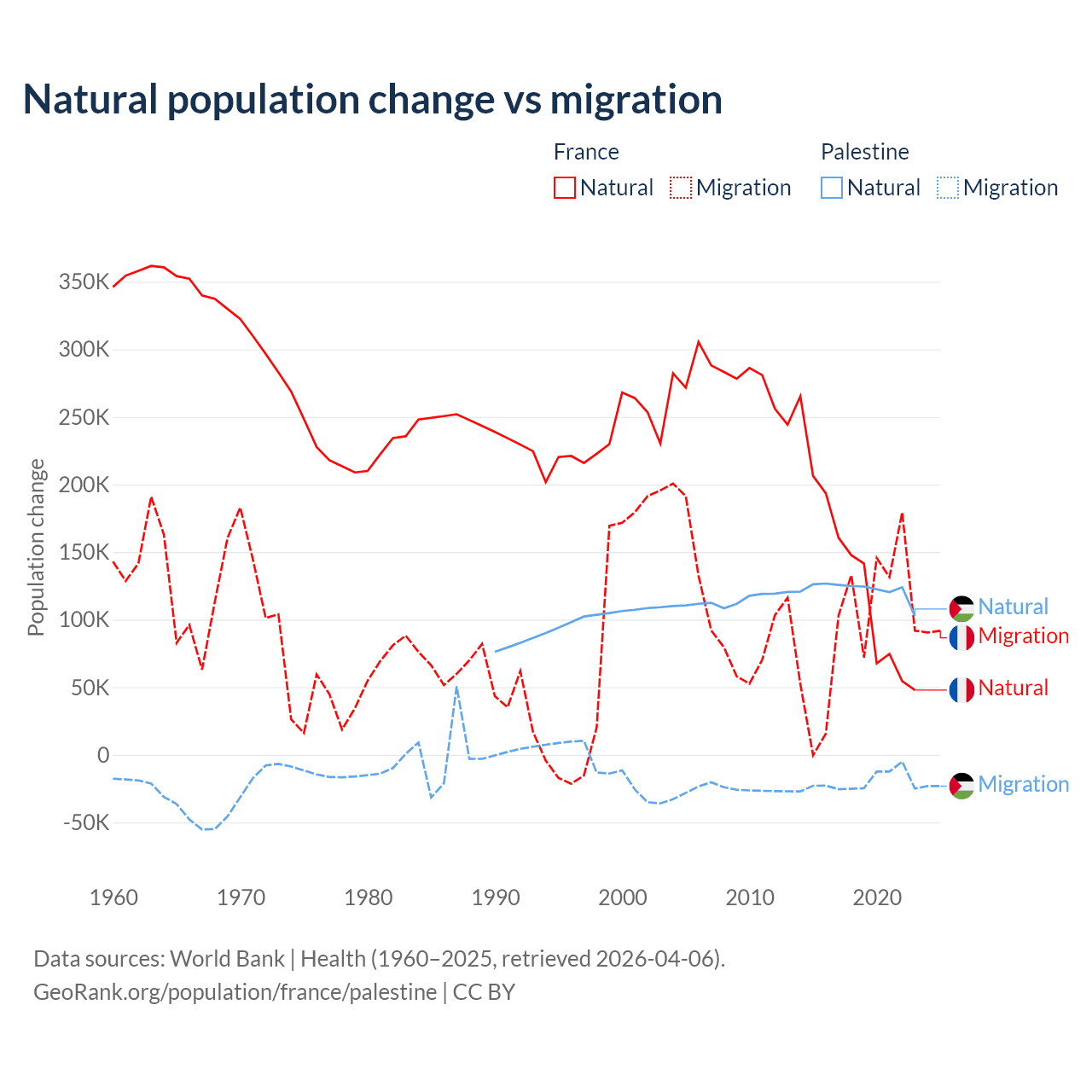 Over the last 10 years, 59.5% of the population change in France is from natural causes (a gain of 1,359,540 people) and 40.5% is from migration (a gain of 923,723 people). In Palestine 85.7% is from natural causes (a gain of 1,218,010 people) and 14.3% is from migration (a loss of 202,820 people).