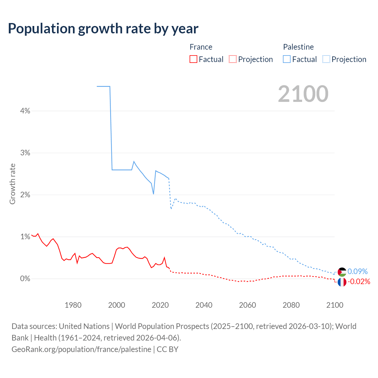 - For the last 10 years, France has had an average growth rate of +0.35% per year vs +2.4% in Palestine.