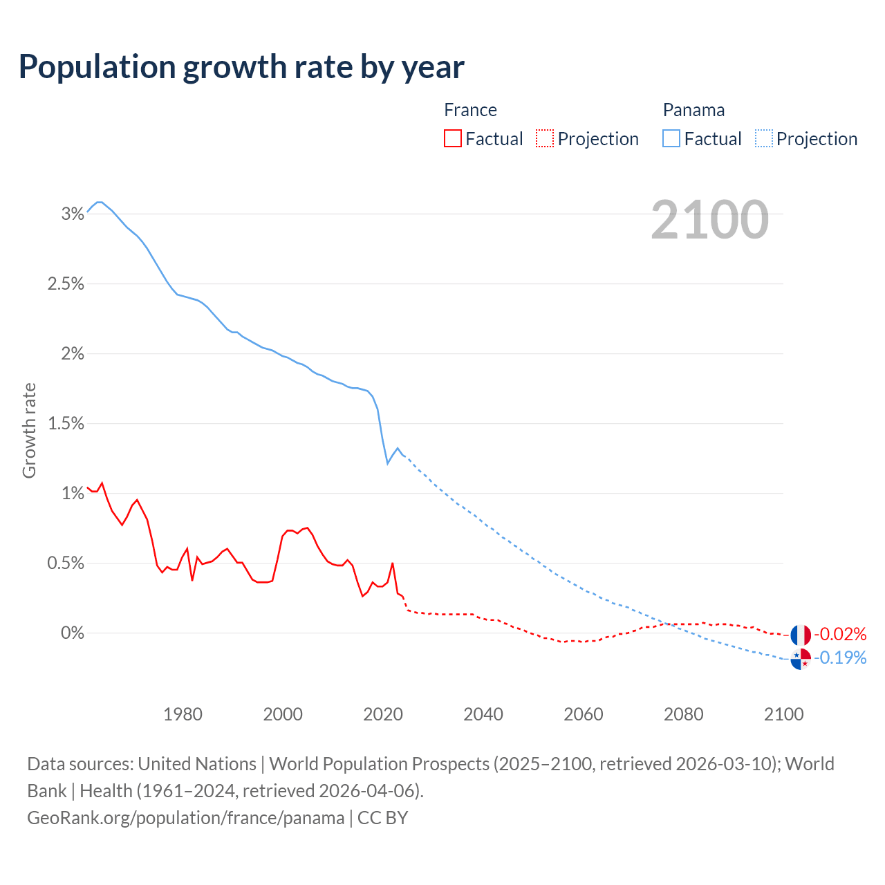 - For the last 10 years, France has had an average growth rate of +0.35% per year vs +1.52% in Panama.