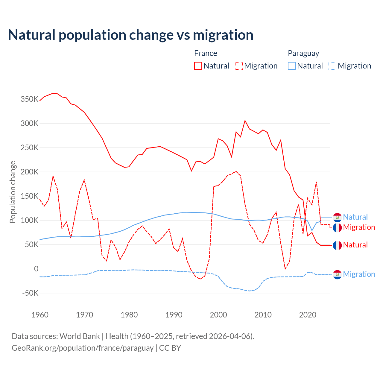 Over the last 10 years, 59.5% of the population change in France is from natural causes (a gain of 1,359,540 people) and 40.5% is from migration (a gain of 923,723 people). In Paraguay 87.6% is from natural causes (a gain of 1,002,636 people) and 12.4% is from migration (a loss of 141,377 people).
